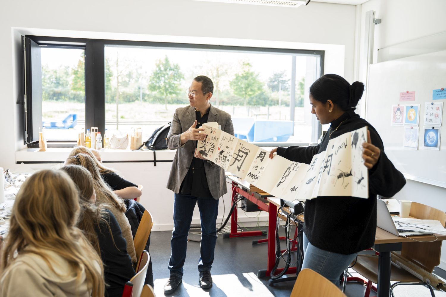 Bei „David“ Song Hui, einem chinesischen Kalligraphen und Tuschemaler, bekam die Gruppe anschließend eine Einführung ins Tuschemalen. Die Schülerinnen und Schüler versuchten sich selbst am chinesischen Zeichen für Mond und erstellten kleine Gemälde unter anderem von der Mondgöttin Chang’e und dem dazugehörigen Jadehasen. So entstanden nicht nur zwei zehn Meter lange Bänder an Gemälde und Schriftzeichen, sondern auch viele Einzelkunstwerke der Schülerinnen und Schüler.