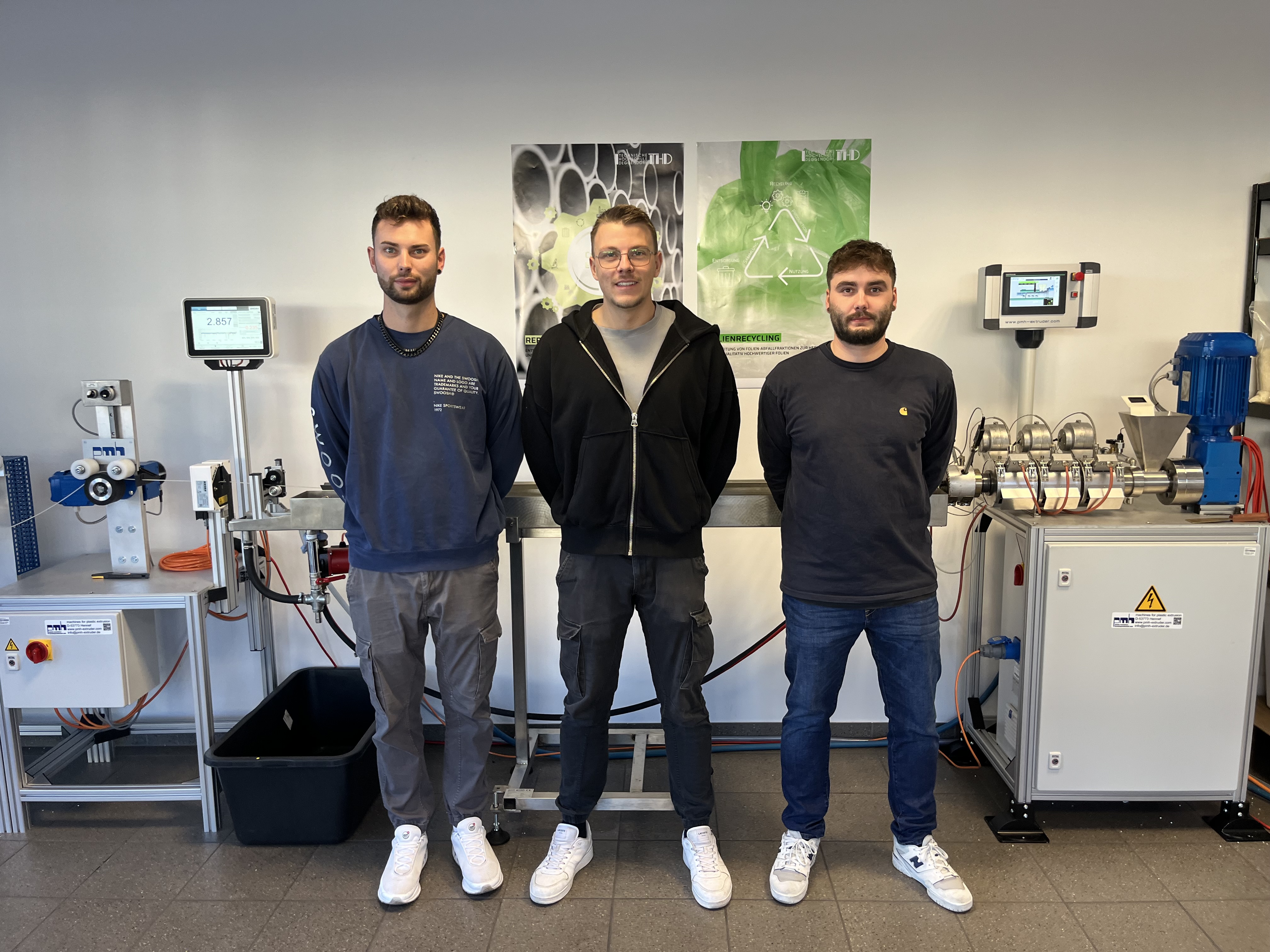 Drei angehende staatlich geprüfte Techniker des Beruflichen Schulzentrums Wasserburg a. Inn führen ihre Projektarbeit am Technologie Campus Hutthurm durch. Ziel des Projekts ist es, herauszufinden, wie sich mechanische und thermische Eigenschaften von Kunststoffen bei mehrfacher Wiederverwertung verändern.