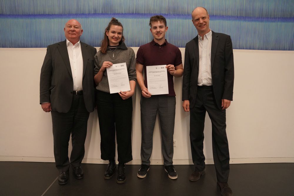 Bild (THD): Vorgezogenes Weihnachtsgeschenk: Die Physician Assistant-Studierenden und Cook Islands-Stipendiaten Antonia Hofmann und Elias Paulus zwischen THD-Präsident Prof. Waldemar Berg (links) und Prof. Dr. Dr. med. habil Mathias Burgmaier.