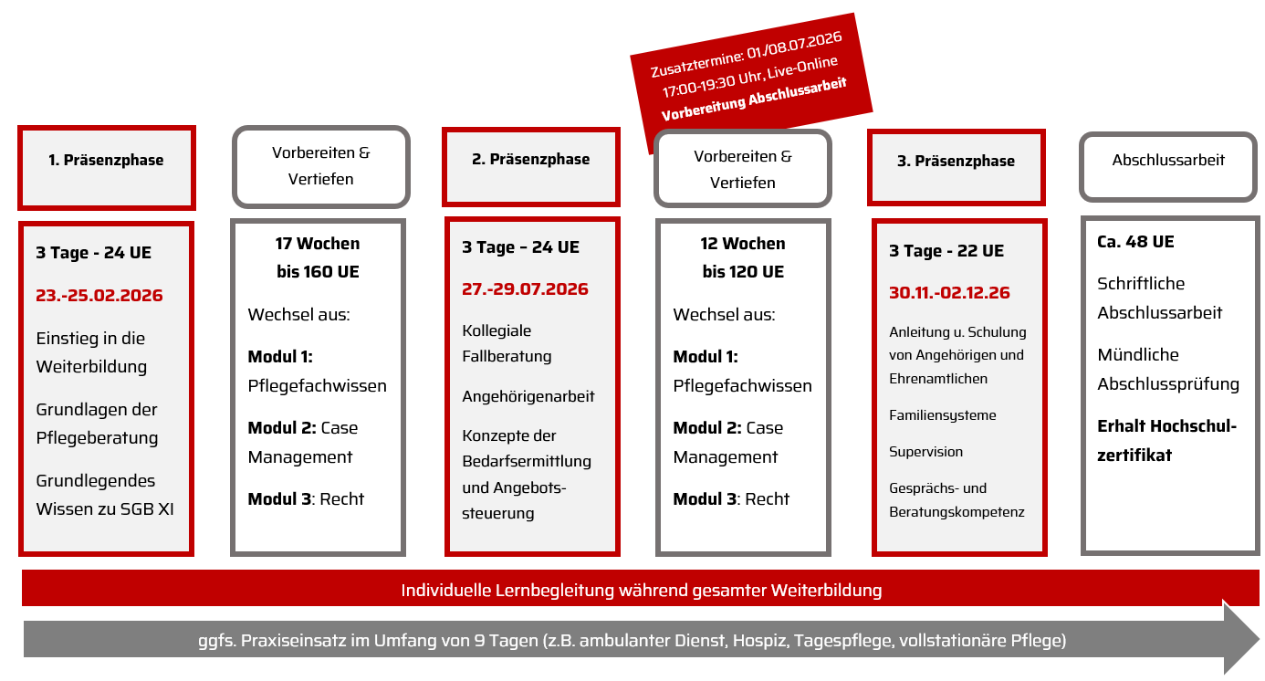 Die Weiterbildung "Pflegeberatung nach §7a SGB XI" ist in drei Module aufgeteilt und umfasst insgesamt 400 Unterrichtsstunden: