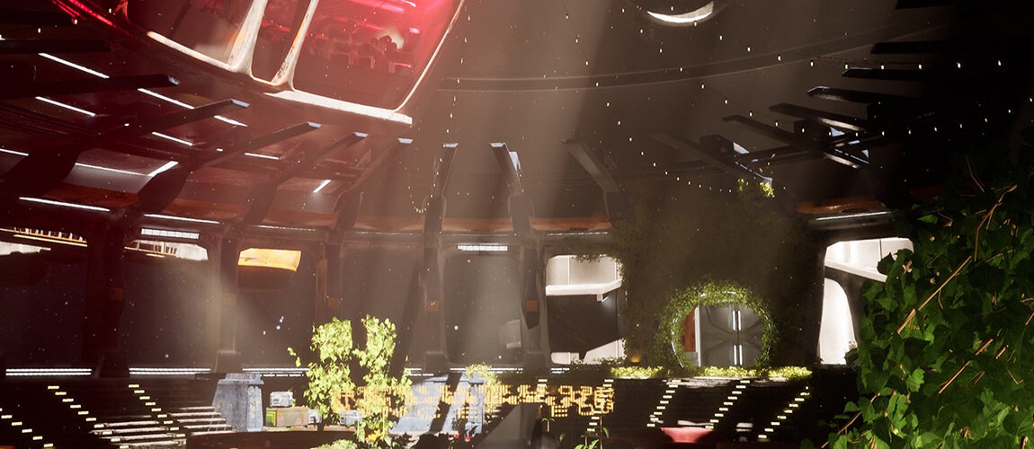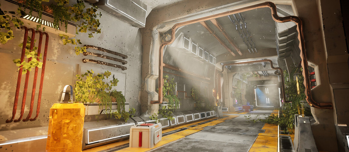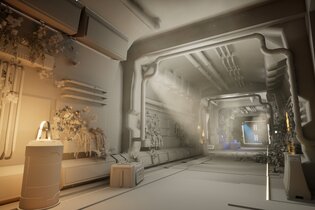 Auch das Environment des verlassenen Raumschiffs wurde vollständig neu erstellt. Der Aufbau der Spielwelt basiert auf modularen Assets, die einen flexiblen und iterativen Leveldesign Prozess ermöglichen. Die einzelnen Bereiche wie Promenade, Kontrollraum, Gewächshaus, Lagerräume und Roboter Ladestationen wurden von Grund auf in 3ds Max modelliert und anschließend texturiert. Durch die modulare Struktur konnte die Umgebung schrittweise erweitert und angepasst werden, ohne die visuelle Konsistenz der Spielwelt zu verlieren. Ziel war es, eine glaubwürdige, atmosphärische Umgebung zu schaffen, die die narrative Ausrichtung des Projekts unterstützt.
