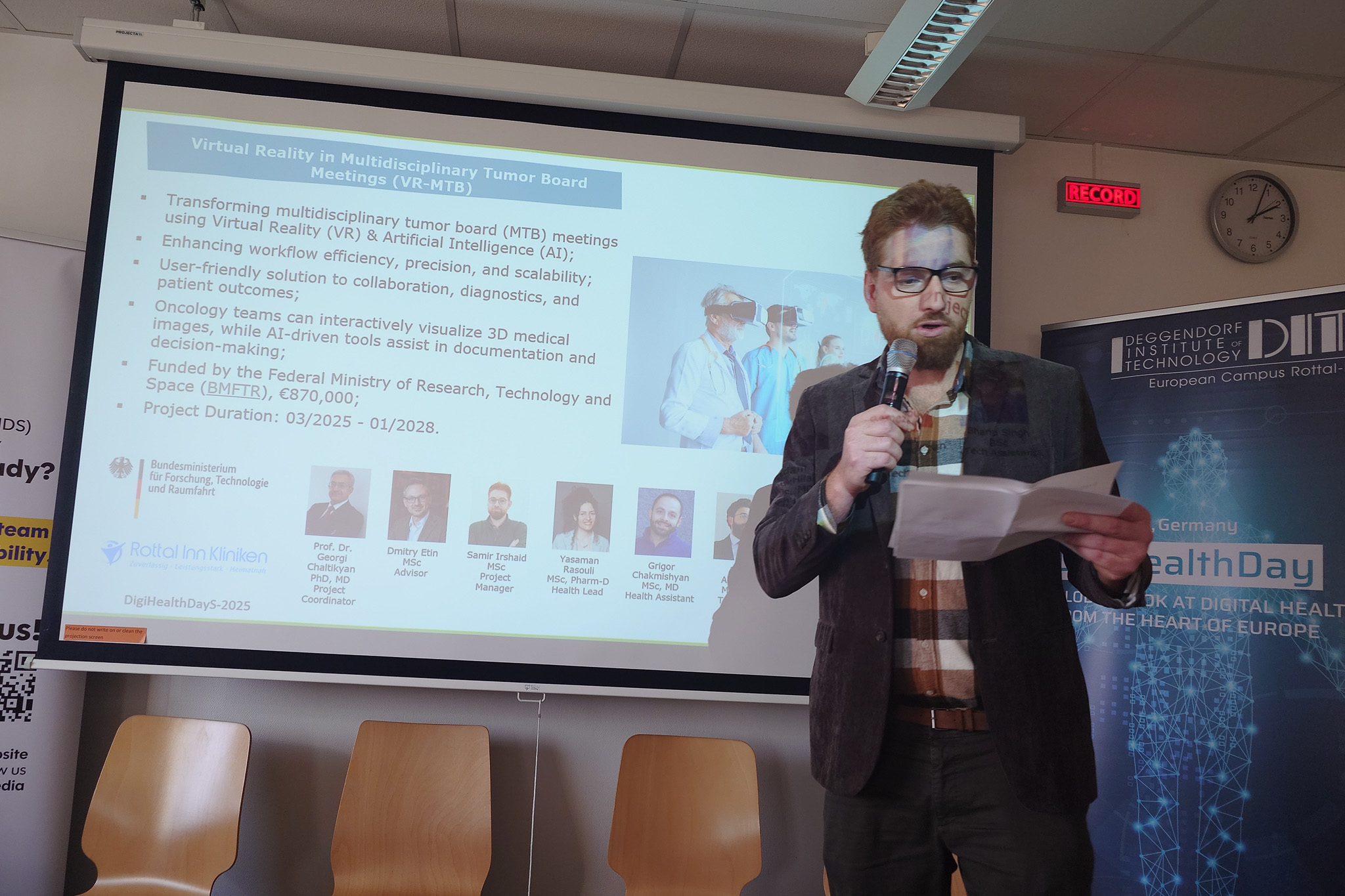 As part of DigiHealthDayS-2025, the VR-MTB Workshop was held on Thursday, 13 November 2025 at the European Campus Rottal-Inn (ECRI), Pfarrkirchen, in a hybrid format. The session was open to the public and invited clinicians, researchers, digital health professionals, IT experts, students, and policy stakeholders interested in multidisciplinary tumor board (MTB) workflows and the integration of digital technologies.