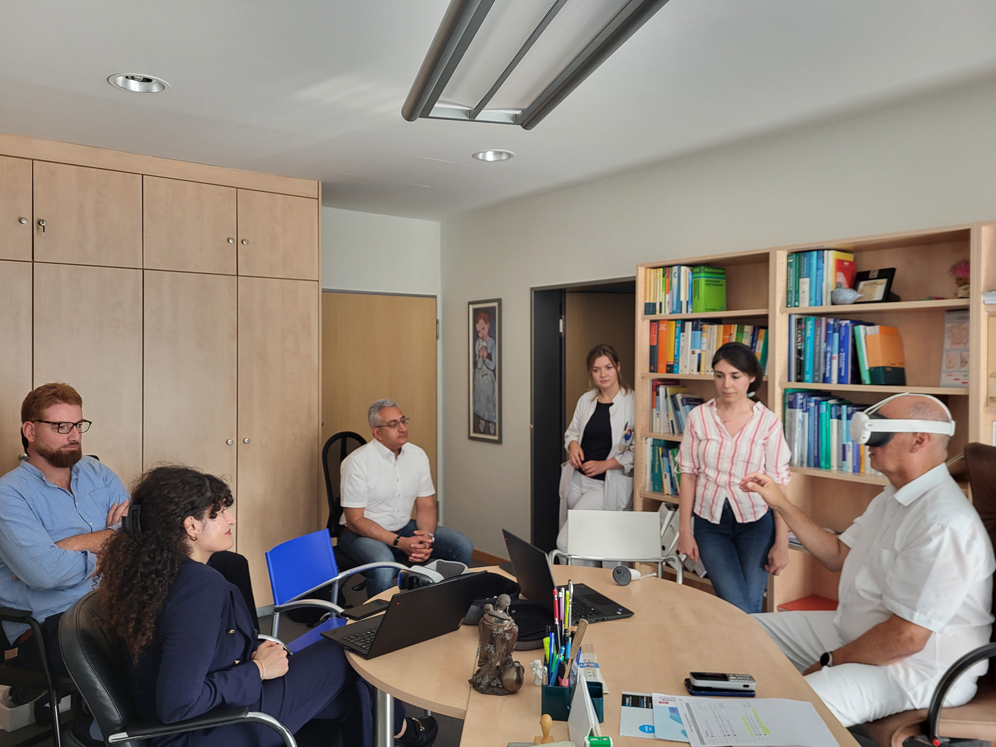 June 2025, at the Rottal-Inn Clinic in Eggenfelden, the VR-MTB project team—led by Prof. Dr. Georgi Chaltikyan and composed of Samir Irshaid, Adam Abuhilal, Niloufar Ramezanzadegan, Bhanu Pratap Singh, Yasaman Rasouli, and Grigor Chakmishyan met with Robert Koch and Florian Pletz, CEOs of the clinic, along with key representatives from the administrative and IT departments, including Nicole Bachmeier, Josef Stempl, and Marcel Nagl. The meeting aimed to further strengthen their strategic collaboration within the VR-MTB: Virtual Reality for Multidisciplinary Tumor Boards project, an initiative funded by the Federal Ministry of Research, Technology and Space (BMFTR).