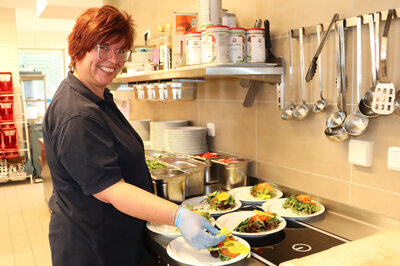 Seit gut einem Jahr wird der Speiseplan für Pfarrkirchen in Passau zusammengestellt. Das macht es schwierig, vor Ort bei Hauptgerichten auf spezielle Wünsche einzugehen. Entgegenkommen zeigt Manuela Zeller stets bei den vorgesehenen Beilagen wie Kartoffeln, Reis oder Nudeln. Diese können bei ihr ganz nach Gutso variiert werden. „Geht nicht, gibt´s nicht“, lautet ihr Motto in dieser Hinsicht. Unterm Strich erweist sich Manuela Zeller in der Mensateria als Mädchen für alles und sagt: „Ich kümmere mich zusammen mit meinem Kollegen um das Bestellen der Ware, das Kochen, Kassieren, Aufräumen und das Putzen."