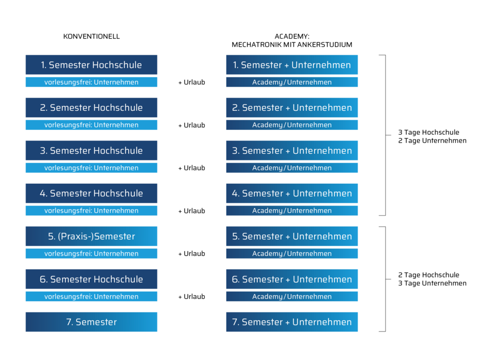Der reguläre Studiengang wird mit Modulen aus dem Campus Cham Academy Programm ergänzt. So wird auch die vorlesungsfreie Zeit genutzt um Vorlesungen anzubieten und der Student bzw. die Studentin ist dadurch durchgehend sowohl während des Semesters als auch der Semesterferien 2 - 3 Tage pro Woche im Unternehmen einsatzfähig. Hier ein Vergleich der beiden Studienverlaufspäne im konventionellem dualen Studium und im Chamer Modell mit dem Academy Programm: