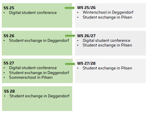 Zu den geplanten Maßnahmen gehören unter anderem der Austausch von Studierenden der Technischen Hochschule Deggendorf und der Westböhmischen Universität Pilsen. Der Austausch findet sowohl in digitaler Form als auch in Präsenz statt. Weiter Informationen hierzu sind im Abschnitt „Veranstaltungen“ zu finden.