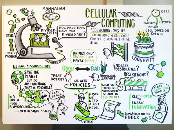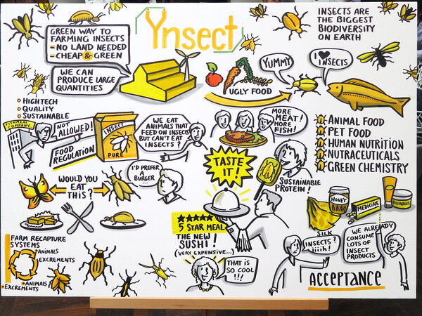 Graphic Recording wird vermehrt in Workshops eingesetzt, um dort den Prozess zur Lösungsfindung voranzutreiben. Man hat sowohl Ansätze als auch Irrwege direkt vor Augen. Nun wäre ich natürlich ein unglaubliches Universalgenie, wenn ich jegliche Materie sofort und spontan in all ihrer Tiefe und Vielschichtigkeit erfassen könnte. Aber das muss ich auch gar nicht. Was ich auf Veranstaltungen immer wieder beobachte: der Spezialist und die Fachfrau schauen auf das Bild mit all ihrem Vorwissen im Hintergrund und denken es weiter. Das ist faszinierend und auch immer wieder sehr befriedigend für mich. Denn es zeigt mir, dass die Bilder für den Betrachter wirklich Sinn ergeben.