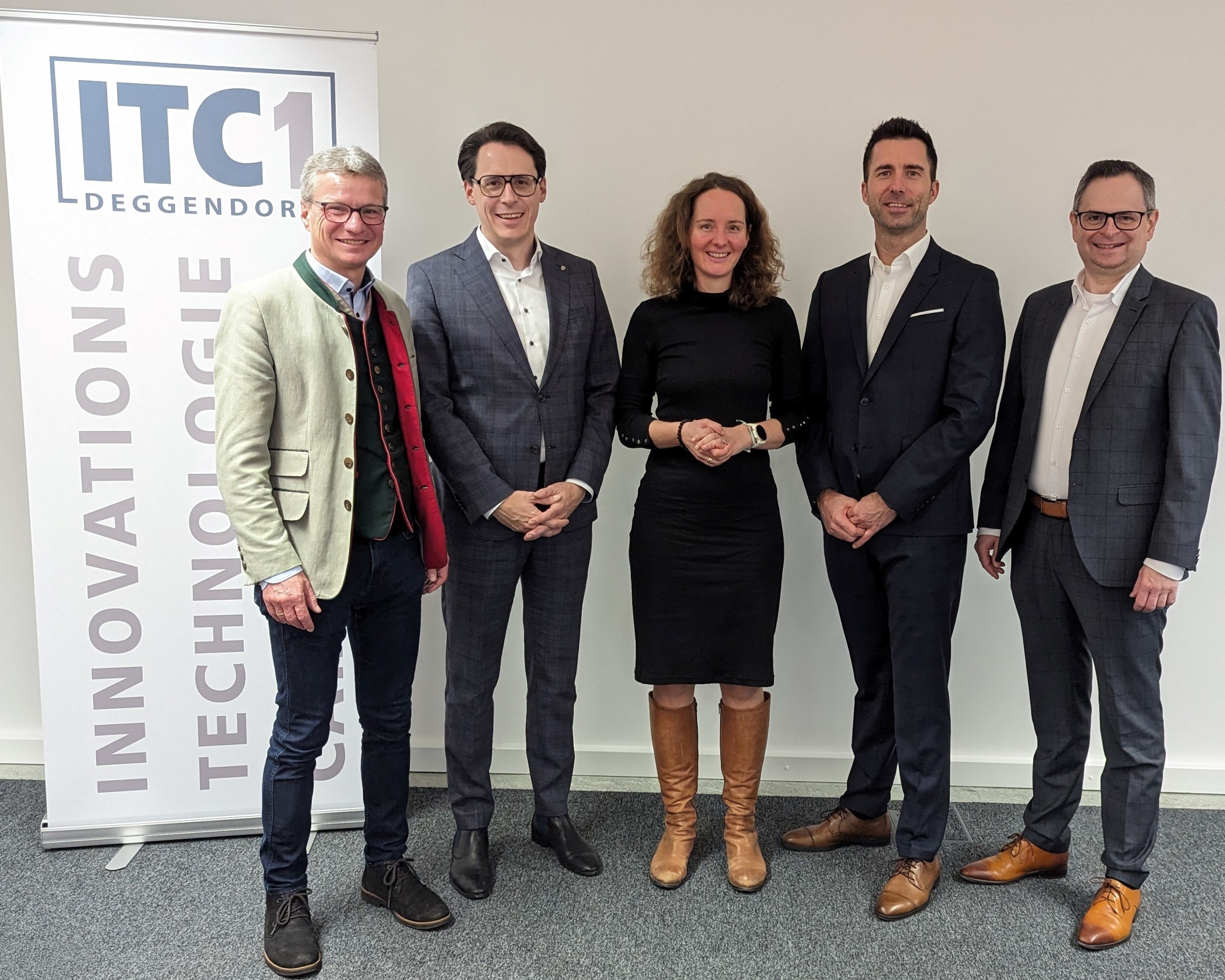Bild (ITC1): Geschäftsführerin Prof. Dr. Veronika Fetzer (Mitte), Geschäftsführer Thomas Keller (2. v. r.) sowie die Gesellschafter der ITC GmbH von links Landrat Bernd Sibler, Oberbürgermeister Dr. Christian Moser, Sparkassendirektor Stefan Swihota (rechts)