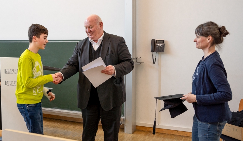 Geschafft! Und noch besser: Gut und glücklich geschafft. Anfang März verabschiedete die Technische Hochschule Deggendorf (THD) ihre Frühstudierenden des Wintersemesters sowie die Teilnehmenden der Wissenschaftlich-Technischen Oberstufe WTO. Vor den anwesenden Dozentinnen und Dozenten der THD, Lehrkräften der Schulen und Verwandten wurden die Absolventinnen und Absolventen feierlich entlassen. Frühstudium und WTO ermöglichen leistungsbereiten Schülerinnen und Schülern, erste Studienerfahrung- und punkte noch während der Schulzeit zu sammeln. Diese Möglichkeit nutzten im vergangenen Semester 18 Frühstudierende am Campus in Deggendorf, fünf am Campus in Cham und eine am Campus in Pfarrkirchen. Zusätzlich waren sieben Teilnehmende in der WTO aktiv.