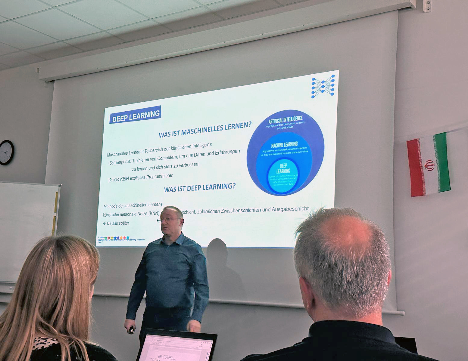 Am Beispiel von Deep Learning wurden im Seminar grundlegende Ansätze und Techniken, aber insbesondere auch Chancen und Risiken vorgestellt, um ein Grundverständnis für KI-Technologien aufzubauen und gleichzeitig mögliche Hemmschwellen abzubauen. Teil der Fortbildung war zudem die praktische Umsetzung, das heißt, wie man mit den heutigen sogenannten „Frameworks“ relativ einfach neuronale Netze erstellen kann. An vorbereiteten Laptops konnten die Teilnehmenden sogar selbst ein neuronales Netz testen. Dabei ging es weniger um die mathematischen Grundlagen als vielmehr um das qualitative Verständnis. Aktuelle Begriffe wie „KI“, „Maschinelles Lernen“, „Deep Learning“ sowie „Neuronale Netze“ wurden im Rahmen der Schulung erklärt. In kleinen Übungen demonstrierten Jürgen Wittmann, Professor für Intelligente Sensor-Aktuatorsysteme, und Dr. Sunil Survaiya, Studiengangsleiter Digital Production Management, anschaulich, wie neuronale Netze programmiert werden können.