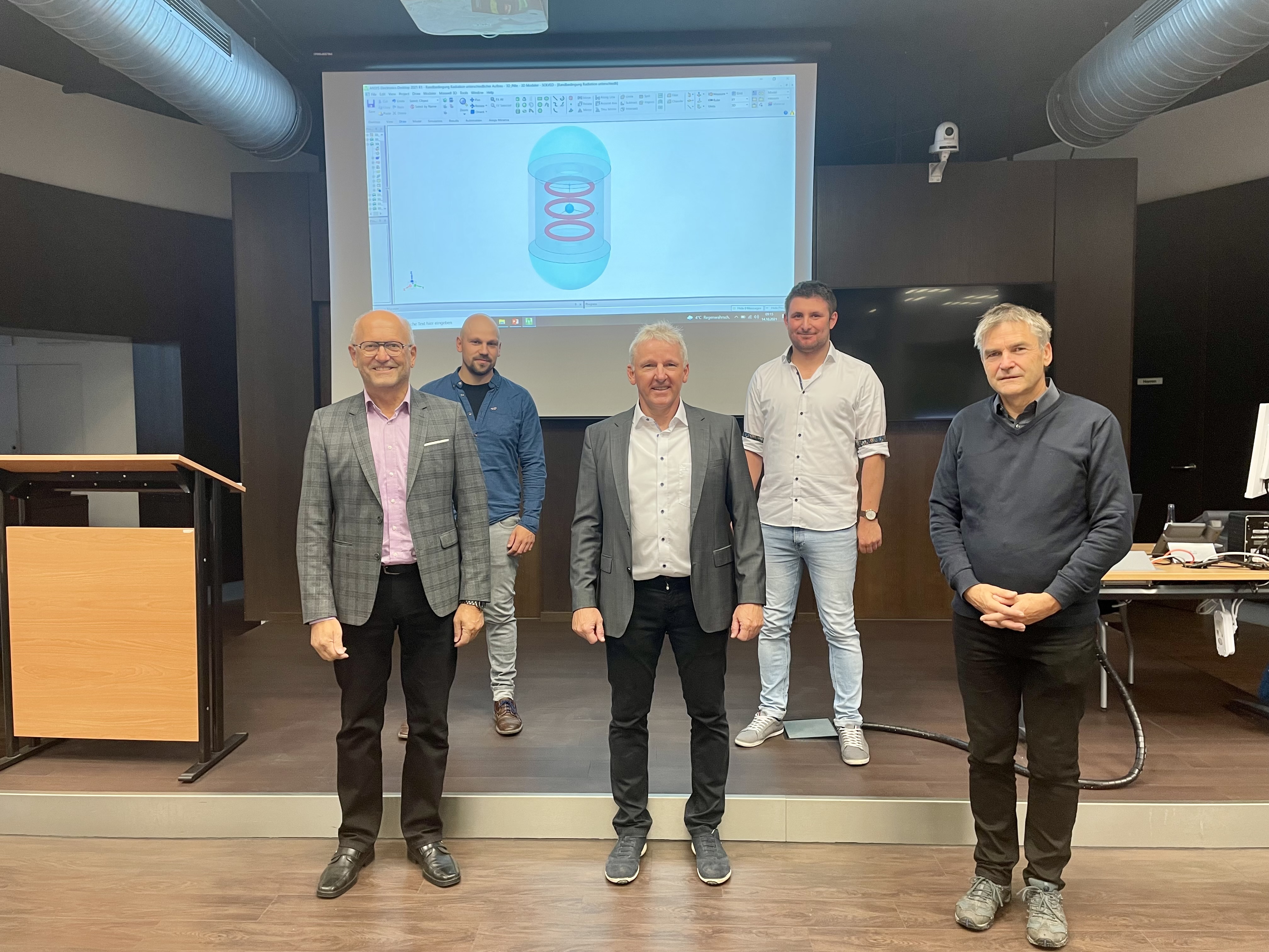 Bild (THD): Vorne rechts Prof. Andreas Grzemba, Vorne Mitte THD Projektleiter Prof. Frank Denk, vorne links Projektleiter Mesutronic Prokurist Manfred Artinger, hinten links Entwicklungsingenieur Mesutronic Stefan Wittenzellner, hinten rechts wissenschaftlicher Mitarbeiter THD Tobias Hofbauer.