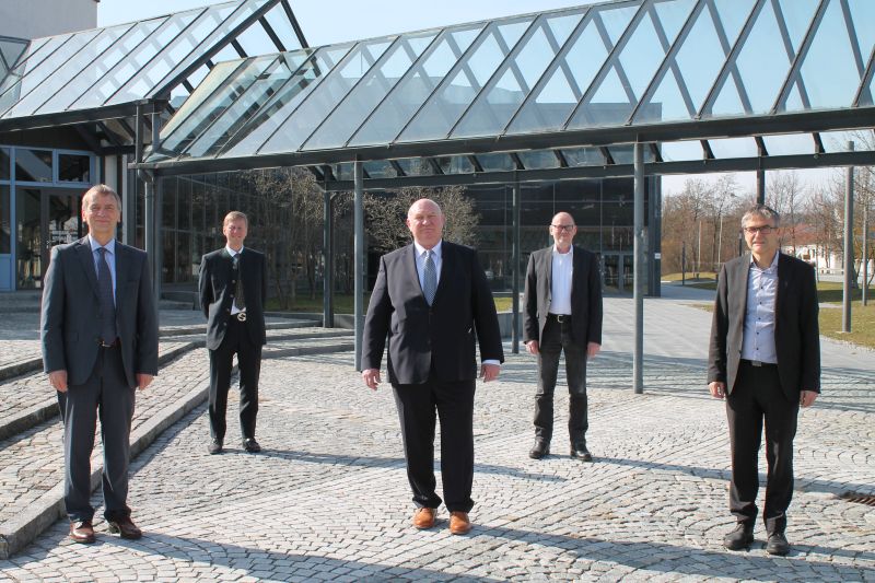 Bild (THD): Die Hochschulleitung der Technischen Hochschule Deggendorf ist wieder komplett: Präsident Peter Sperber (2.v.r.) und der Vorsitzende des Hochschulrates Anton Staudinger (2.v.l.) gratulierten den Vizepräsidenten Andreas Grzemba (rechts), Horst Kunhardt (links) und Waldemar Berg (mitte) zur Wiederwahl.