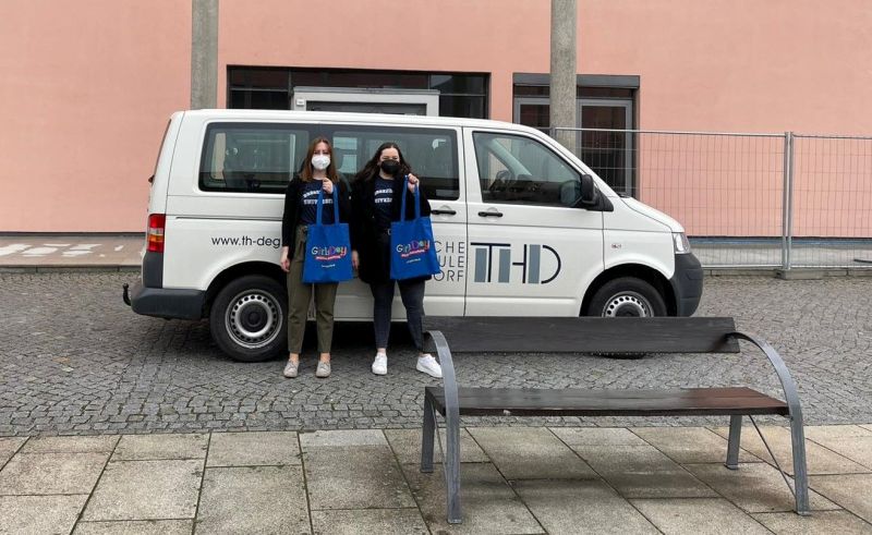 Bild (THD): Zwei Studentinnen der TH Deggendorf unterwegs mit Materialien zum bundesweit veranstalteten Aktionstag Girls’Day, der Mädchen für Möglichkeiten abseits traditioneller Rollenbilder sensibilisieren, neue Wege aufzeigen und eine frühe und praxisnahe Berufsorientierung ermöglichen soll.