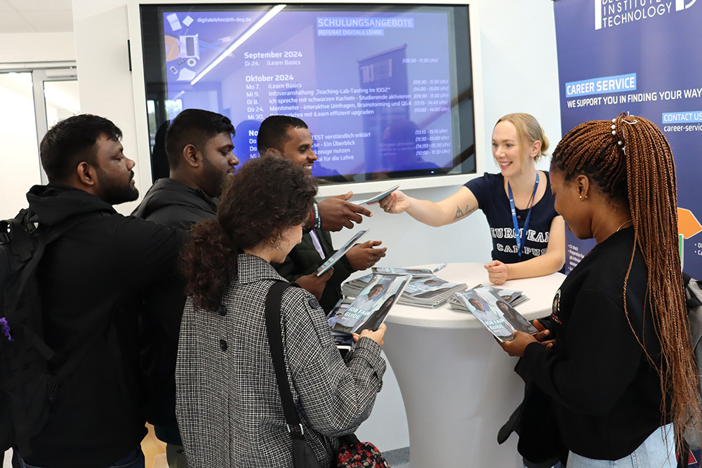 Bild (THD): An einem der Stände informierte Elfriede Hartmann (2. von rechts) vom Career Service die Neuankömmlinge aus 57 Nationen.