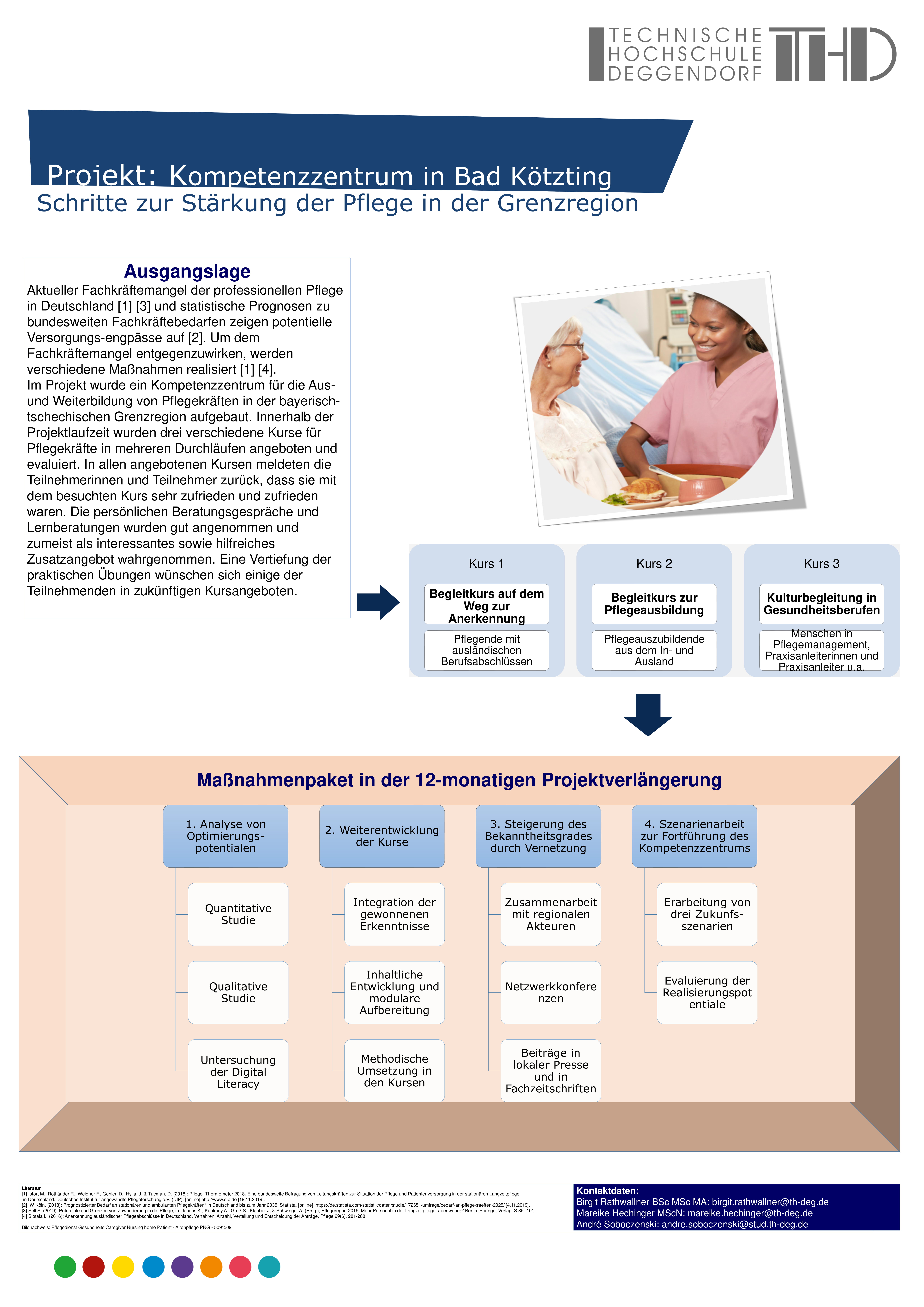 Für die Zielgruppen, Pflegepersonen und Menschen im Pflegemanagement, fand am 05.03.2020 das zweite Forum Altenpflege statt. Es wurde von Frau Nerl und Frau Seidl, Mitarbeiterinnen der Regierung Niederbayern, veranstaltet. Der Veranstaltungsort war die Fakultät Angewandte Gesundheitswissenschaften an der Technischen Hochschule Deggendorf. Der gut besuchte Fachtag befasste sich mit dem thematischen Schwerpunkt der Kommunikation in der Pflege und Betreuung. Dieser wurde mit einem vielfältigen Angebot bestehend aus Präsentationen und Workshops bearbeitet. In der Mittagszeit veranstaltete die Fakultät Angewandte Gesundheitswissenschaften einen Markt der Möglichkeiten. Dabei wurden die Studiengänge der Fakultät, das Lern- und Transferzentrum sowie aktuelle Projekte vorgestellt. Das Projekt Kompetenzzentrum war mit einem Stand und einem Poster mit dabei. Präsentiert wurde das geplante Maßnahmenpaket der 1-jährigen Projektverlängerung