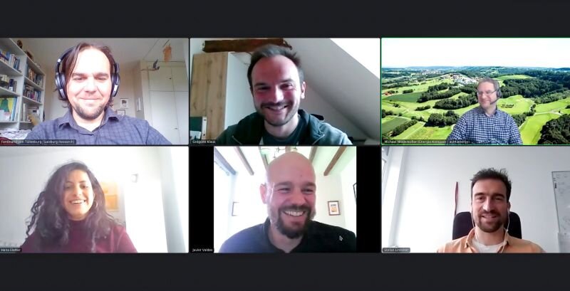 Bild (TC Freyung): Arbeiten gemeinsam im Projekt CrossChargePoint: Ferdinand von Tüllenburg (Salzburg Research Forschungsgesellschaft), Grégoire Klaus (TC Freyung), Michael Niederkofler (Energie Kompass), Hana Elatter (TC Freyung), Javier Valdes (TC Freyung), Stefan Linecker (Salzburg Research Forschungsgesellschaft).
