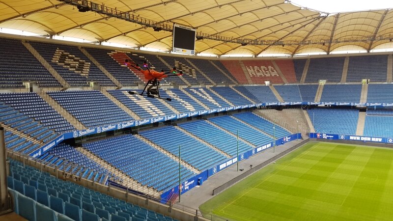 Bild (Stefan Kunze/THD): Zivile Drohne aus dem Projekt ArGUS bei einem Testflug im Hamburger Volksparkstadion.