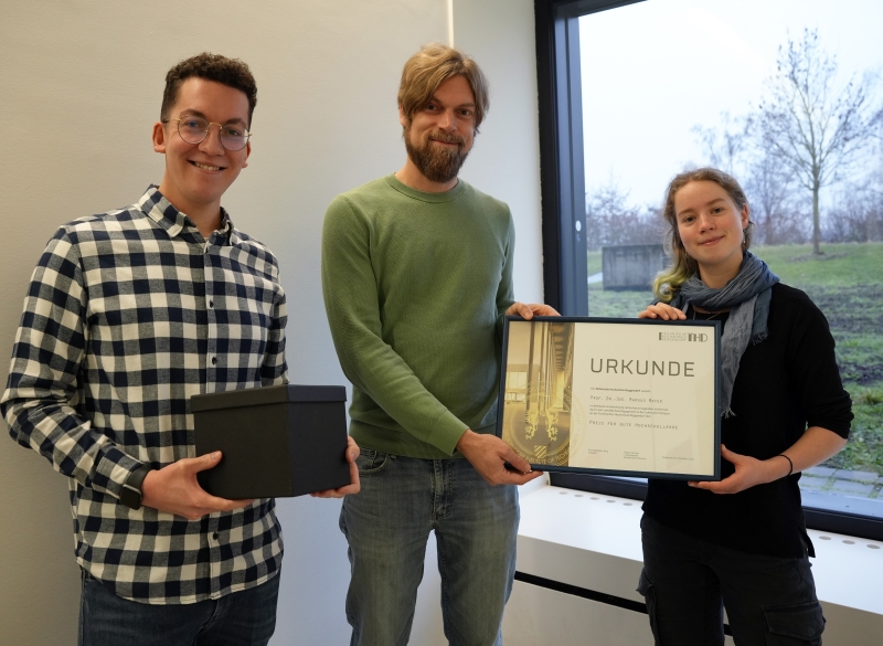 Bild (THD): Fabian Thurner (l.) und Valerie Strauß (r.), die Vorsitzenden des Studentischen Konvent der THD, übergeben den Preis für gute Hochschullehre an Prof. Dr. Markus Mayer (Mitte).