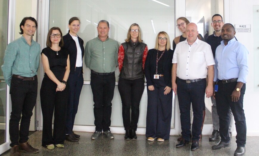 Bild (privat): Internationale Zusammenarbeit: Der Dekan der Stellenbosch University, Prof. Wikus Van Niekerk (4. v.l.) sowie die südafrikanische Projektleiterin Prof. Cristina Trois (5. v.r.) und der deutsche Projektleiter Prof. Dr. Tobias Bader (3. v.r.).