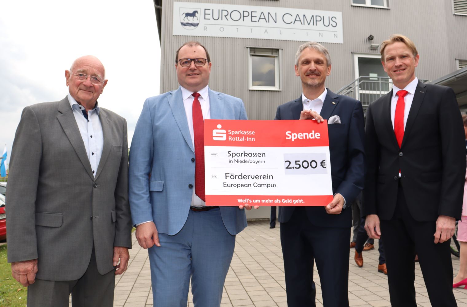 Bild (ECRI/THD): Bei der feierlichen Übergabe des Spendenschecks in Höhe von 2.500 Euro am European Campus Rottal-Inn: (von links) Hochschulkoordinator Georg Riedl, ECRI-Fördervereinsvorsitzender Landrat Michael Fahmüller, Dekan Prof. Dr. Christian Steckenbauer und Sparkassen-Vorstandsvorsitzender Martin Ruhland.