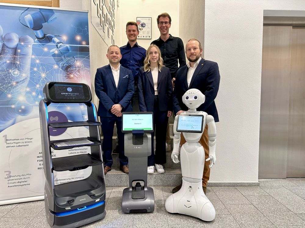 Das Grafenauer Team »Athegus« mit Sebastian Schmidt, Tobias Greiler und Stefan Fischer und Eva Pletl hat endlich Gewissheit: Seit dem 1. Mai hält es nämlich den Zuwendungsbescheid für die erste EXIST-Forschungstransfer Förderung in der Geschichte der Technischen Hochschule Deggendorf (THD) in Händen. Mit ihrem Vorhaben »hospOS«, einem Betriebssystem für Service-Roboter im Gesundheitssystem, wollen sie der Überlastung des Pflegepersonals entgegenwirken. Dafür erhalten sie nun eine Förderung von exakt 740.234,64 Euro.