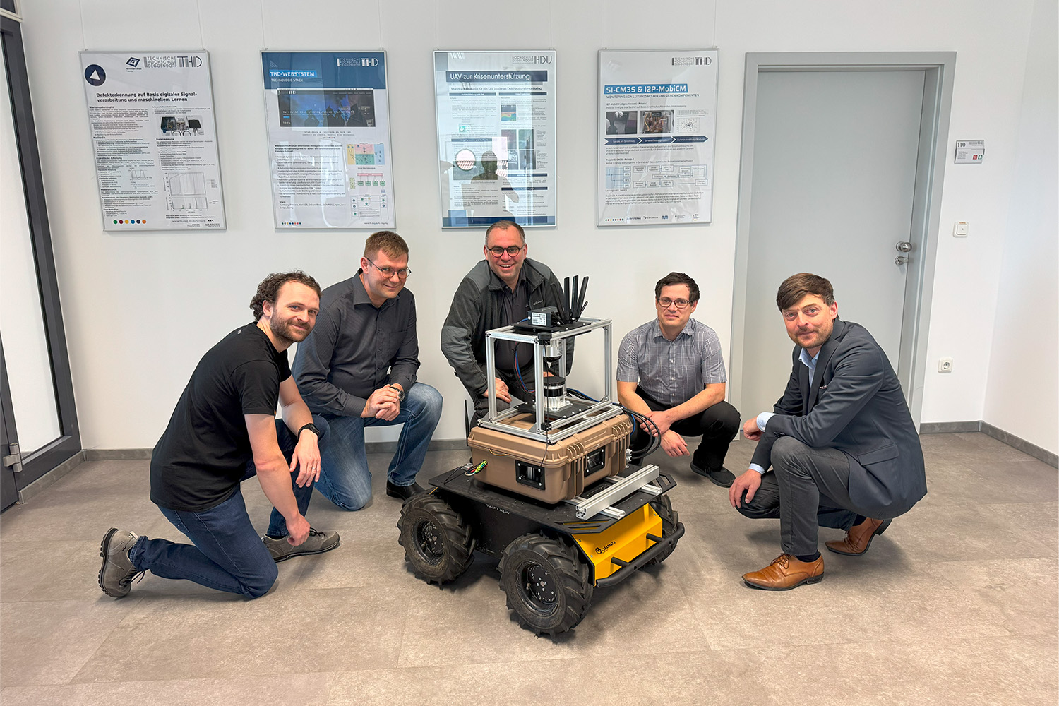 Bild (THD): Das Projektteam mit einem vernetzten autonomen Roboter der ČVUT Prag; v. l. Simon Uhrmann (THD), Markus Peterhansl (THD), Prof. Ing. Jan Faigl, Ph.D. (ČVUT), Jan Bayer (ČVUT) und Prof. Dr. Wolfgang Dorner (THD).