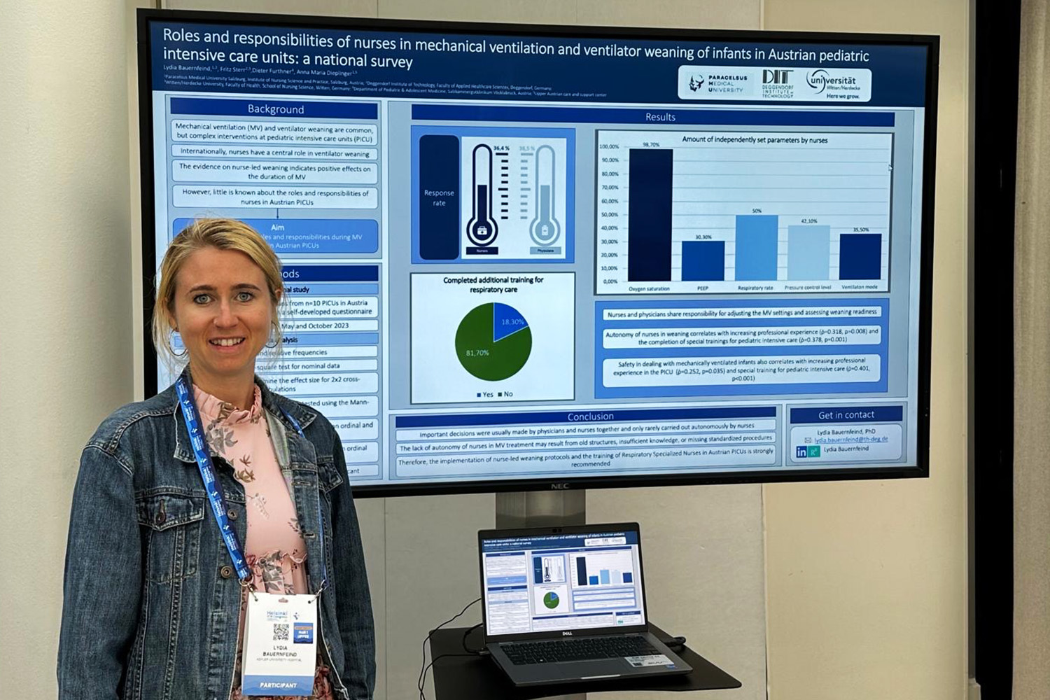 In Finnland stellte Lydia Bauernfeind die derzeitigen Rollen und die Verteilung der Verantwortlichkeiten von Pflegefachpersonen bei der Beatmungsentwöhnung von Kindern auf österreichischen Intensivstationen vor. In ihrer Dokumentation hielt sie fest, welche Aufgaben aktuell vom Pflegepersonal und welche ausschließlich von Ärztinnen und Ärzten übernommen werden. Außerdem beschrieb sie Potenziale für Verbesserungen. Neben der weiteren Prozessstandardisierung widmet sich die Forscherin nun der Entwicklung einer speziellen Aus- beziehungsweise Weiterbildung im Bereich der Atmung und Beatmung bei Kindern, die zukünftig die Versorgung durch pädiatrische Intensivpflege verbessern soll. Hierfür identifiziert Bauernfeind die Inhalte, die besonders in den Fokus gerückt werden sollen.