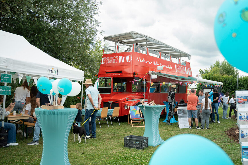 Zwischen Strandbar und Schiffsanleger parkte der knallrote Oldtimer-Doppeldeckerbus der Technischen Hochschule Deggendorf (THD), daneben die Experimentierstationen des MINT-Teams, drumherum zahlreiche Liegestühle zum gemütlichen Verweilen: Zum ersten Mal war die THD mit einem großen Stand beim Donaufest dabei. Das täglich wechselnde Programm bot jede Menge Technik und Wissenschaft zum Anfassen. An allen vier Tagen mit an Bord: Das MINT-Team der THD. Mit spannenden Alltagsexperimenten und verschiedenen Technik-Challenges fanden Kinder spielerisch Zugang zum Programmieren oder konnten physikalische Phänomene erkunden. Natürlich wurden während der vier Eventtage auch allgemeine Fragen rund ums Studieren an der THD beantwortet und Maskottchen Deggster durfte auch nicht fehlen.