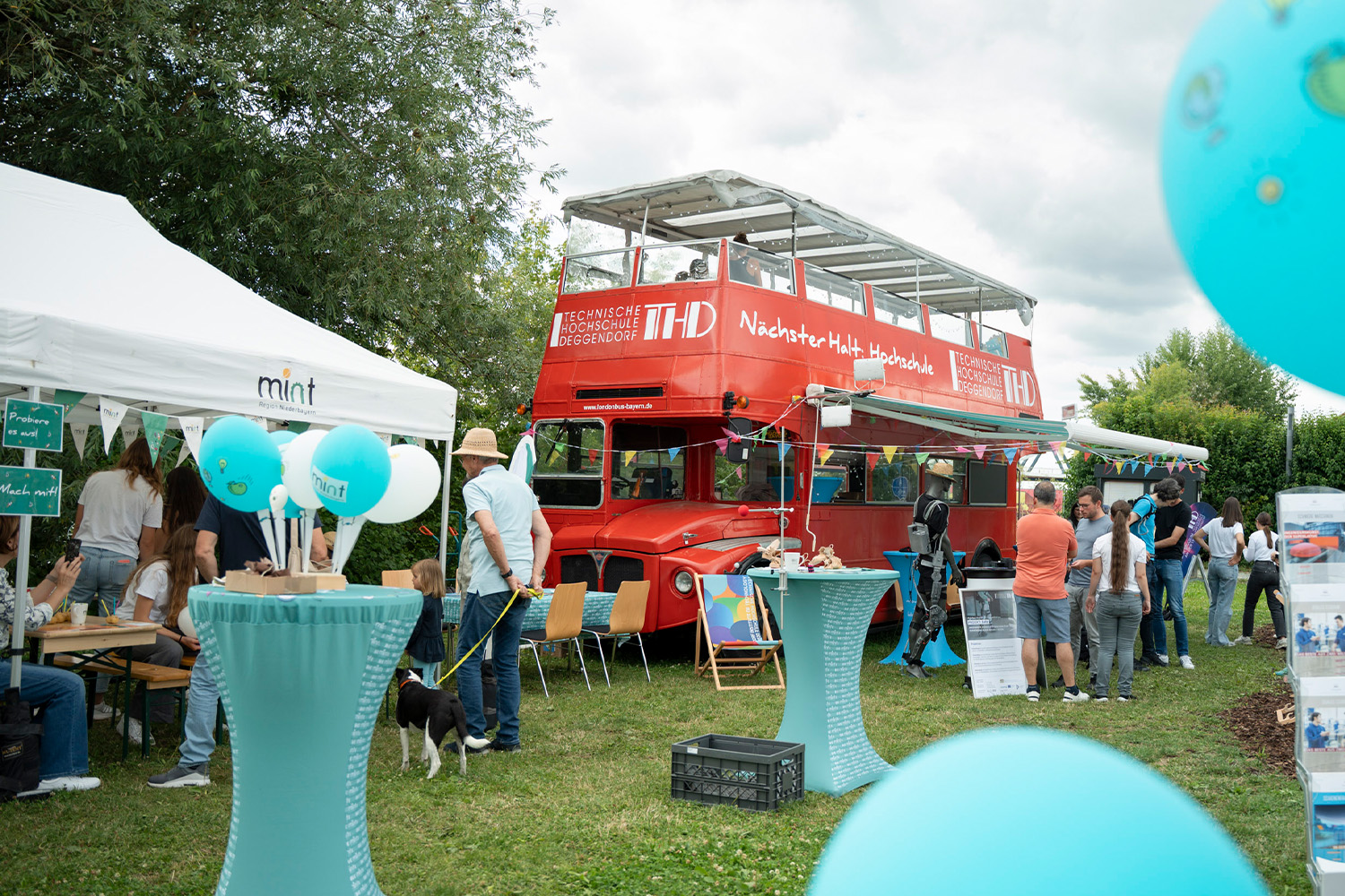 Bild (THD): Von Drohnen bis VR-Technik: Der Doppeldecker der TH Deggendorf war beim Deggendorfer Donaufest bis obenhin vollgepackt mit spannenden Themen aus Wissenschaft und Lehre.