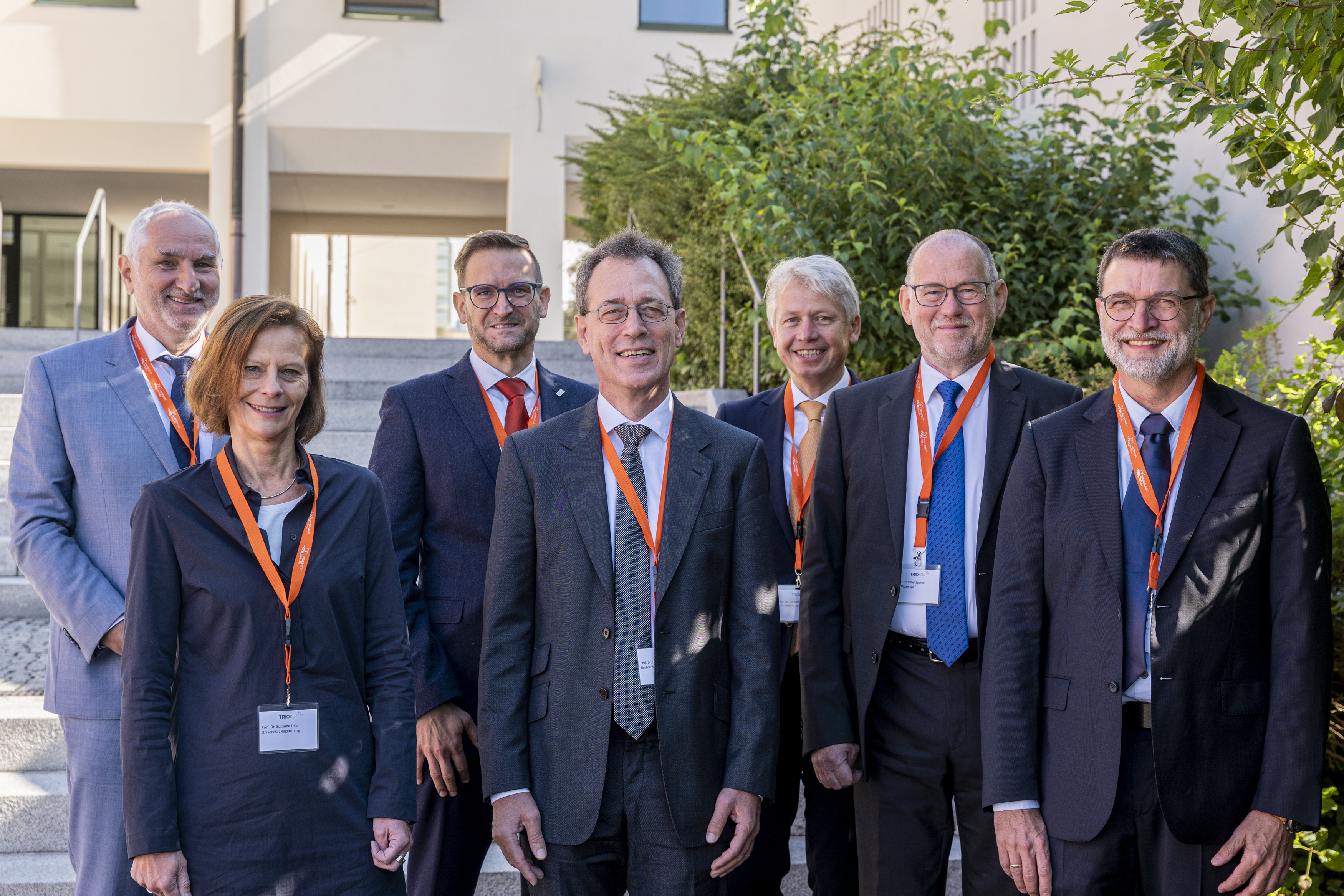 Bild (Universität Passau): Präsident Prof. Dr. Ulrich Bartosch (UP), Vizepräsidentin Prof. Dr. Susanne Leist (UR), Vizepräsident Prof. Dr. Oliver Steffens (OTH-R), Präsident Prof. Dr. Fritz Pörnbacher (HSL), Präsident Prof. Dr. Clemens Bulitta (OTH-A/W), Präsident Prof. Dr. Peter Sperber (THD) und der wissenschaftliche Leiter des Projekts TRIO, Prof. Dr. Tomas Sauer (UP). (von links)