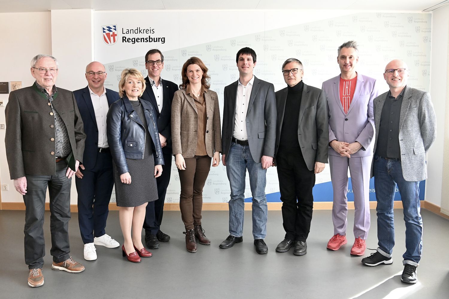 Bild (H.C. Wagner): Von links nach rechts: Gerhard Schmautz, 2. Bürgermeister der Stadt Wörth a.d. Donau, Prof. Dr. Hans Peter Rabl, OTH Regensburg, Elisabeth Kerscher, Bürgermeisterin der Gemeinde Wiesent, Prof. Dr. Ralph Schneider, Präsident OTH Regensburg, Landrätin Tanja Schweiger, Prof. Dr.-Ing. Otto Kreutzer, TH Deggendorf, Prof. Dr.-Ing. Andreas Grzemba, Vizepräsident Forschung und Wissenstransfer TH Deggendorf, Dr. Jörg Kunz, Leiter Wissenschaftskommunikation TH Deggendorf und Roland Weiß, Wirtschaftsförderer Landkreis Regensburg.