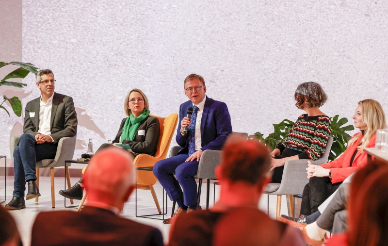 Bild (MINTraum bayern): Beim Zukunftstalk auf dem Podium: (v.l.) Matthias Mörk, Andrea Stelzl (THD), Christoph Petschenka, Julia André, Kultusstaatssekretärin Anna Stolz.