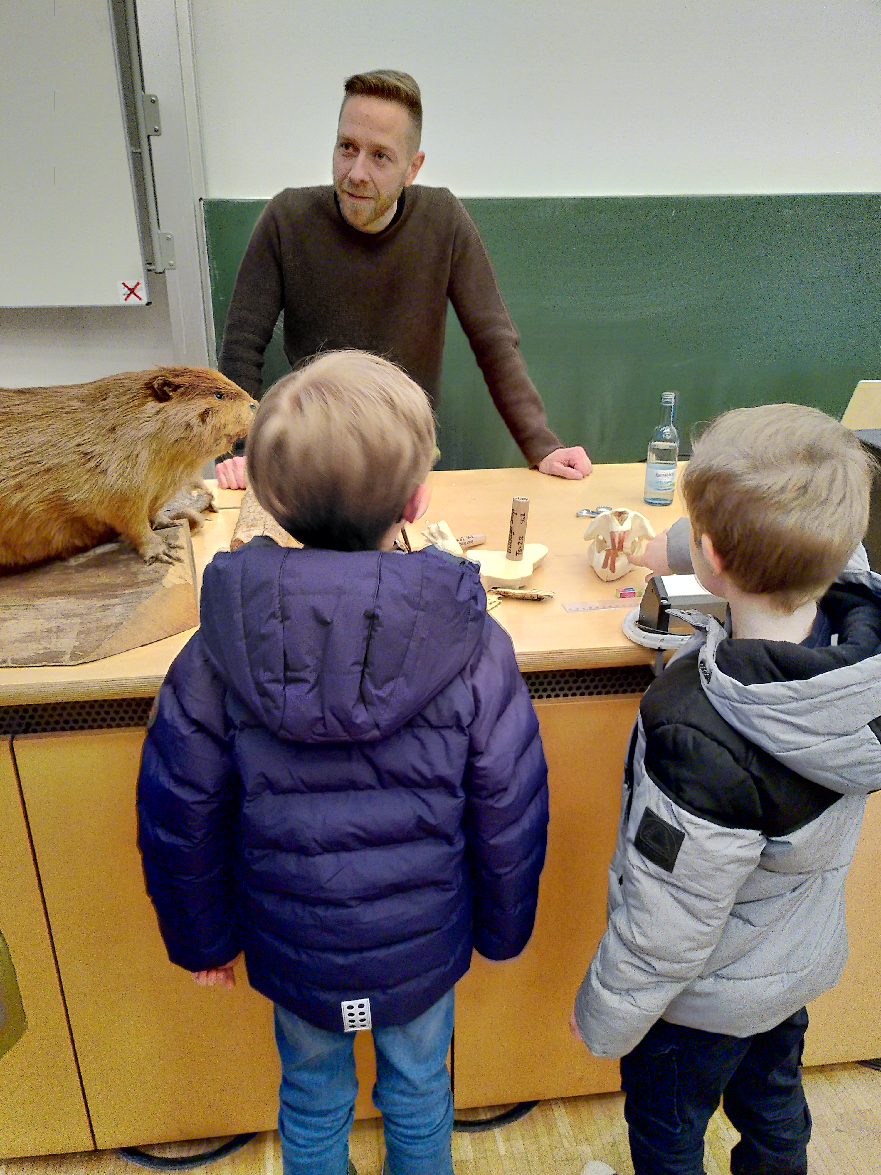 Was den Kindern sofort auffiel waren die orangenen Zähne des Bibers. Ob er sich die nicht putzt, war die Frage der Kinder. Daran liege es nicht, erzählte Michler. Sondern daran, dass der Biber sich selbst schärfende Zähne besitze. In die Vorderseite der Schneidezähne sei Eisen eingebaut, so dass er prima Holz durchraspeln könne. Dabei produziert er Spähne so groß wie vier Bleistifte nebeneinander. Die Rückseite der Zähne sei nicht so verpanzert, sondern weicher. Damit würden sich die Zähne immer wieder nachschärfen. Dieses Phänomen habe man sich auch schon in der Technik von der Natur abgeschaut, wie Angelika Hable, Mitarbeiterin des MINT-Teams der THD und Organisatorin der Kinderuni, wusste. Im Forschungsbereich der Bionik übersetze man immer wieder Erfindungen aus der Natur in technische Anwendungen. So auch z. B. sich selbst schärfende Messer.
