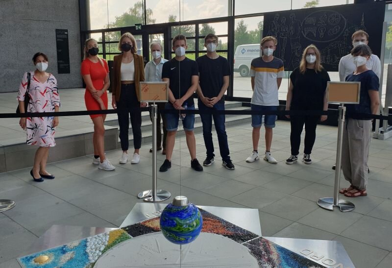 Bild (THD): Die Campustour führte die Frühstudierenden und ihre Lehrkräfte auch zum Foucaultschen Pendel. Begleitet wurden sie von Angelika Hable von der THD (r.).