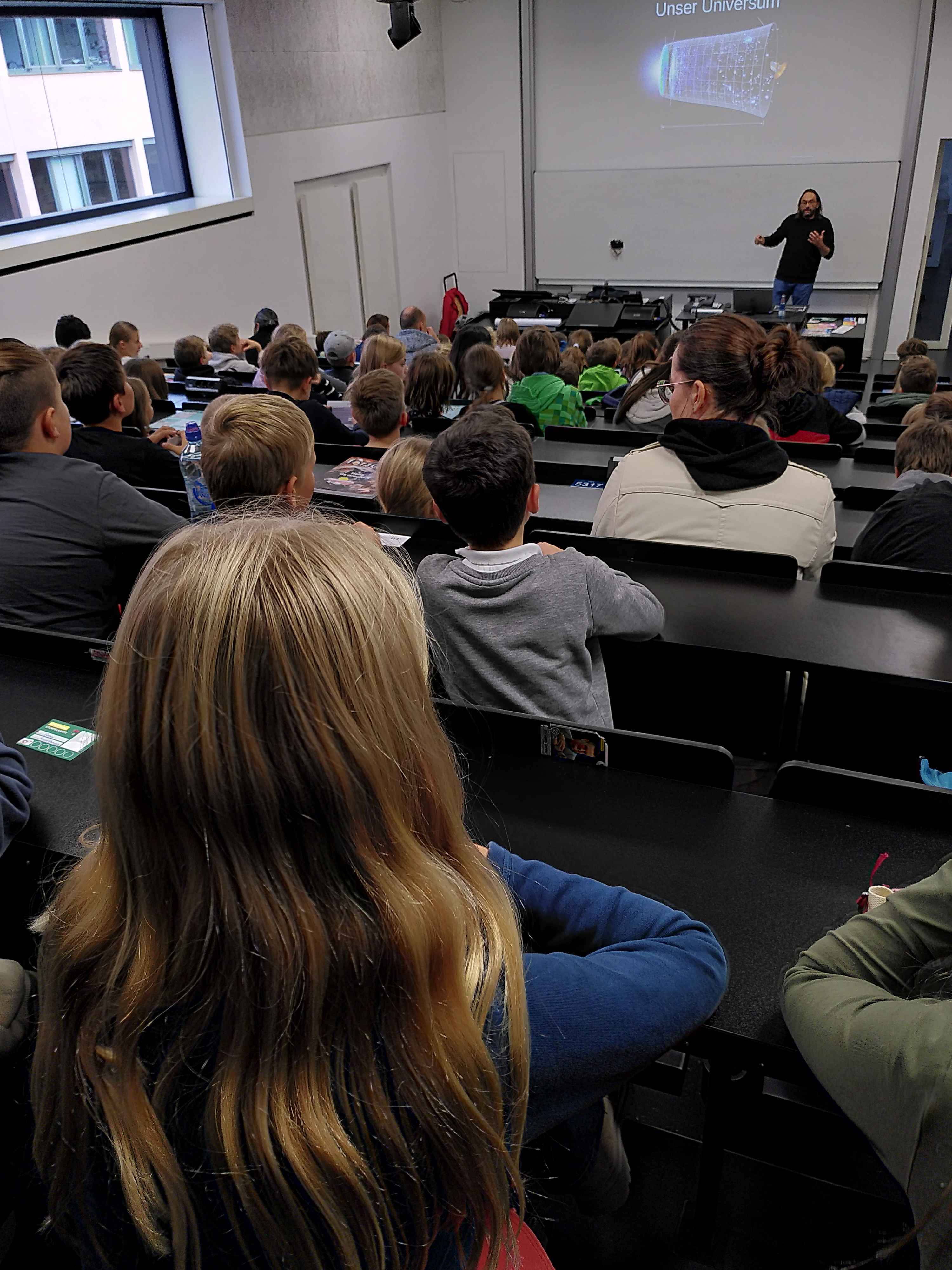 Passend zum aktuellen Wissenschaftsjahr hieß das Thema zum Auftakt „Unser Universum“. Dozent Sigmund Leitl, erster Vorstand der Volkssternwarte Winzer, fragte gleich zu Beginn, was den jungen Forschenden zu dem Thema einfallen würde. Viele Begriffe wurden in den Raum geworfen, von Meteorit bis Schwarzes Loch. Herr Leitl kam kaum nach mit dem Notieren an der Tafel. Und dann ging’s auch schon los mit dem Urknall. Die Kinder hörten von Elektronen, Neutronen und Wasserstoff, welche Elemente aus Helium in der Sonne hergestellt werden können und welche Sterne die uns nächsten sind. Mit beeindruckenden Farbbildern, die die Größenunterschiede der Sterne verdeutlichten, brachte Sigmund Leitl die Kinderaugen zum Strahlen und gingen erstaunte Ahs und Ohs durch die Reihen. Zum Abschluss erfuhren die Kinder, wie sich Sterne verbrauchen, ausdehnen und schließlich implodieren. Dann war es Zeit für die Fragen der Kinder. Viele Hände schossen in die Höhe. „Was passiert, wenn zwei Galaxien zusammenstoßen?“, „Warum dauert ein Flug zum Mars so lang?“ und vieles mehr, wollten die Kinder wissen. Um den zeitlichen Rahmen nicht zu sprengen, lud Kinderuniorganisatorin Angelika Hable alle zur nächsten Kinderuni am 24.11. ein und diejenigen, die noch Fragen hatten, nach vorn zum Dozenten, wo sie sich noch weiter mit ihm im kleineren Kreis austauschen konnten.