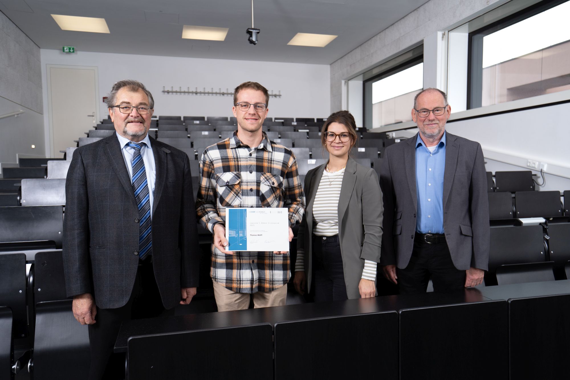 Bild (THD): Die Übergabe der Stipendiums-Urkunde an der THD: Richard Wander, Vertreter der J.C. Römer Stiftung, Thomas Wölfl (Stipendiat), Vanessa Keilerhofer vom Career Service sowie THD-Präsident Prof. Dr. Peter Sperber.