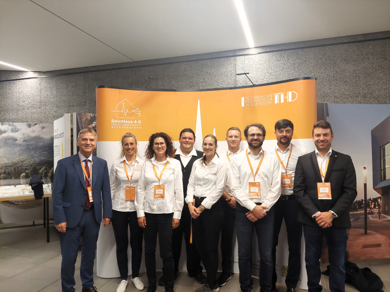 Bild (THD): Das THD-Projektteam „DeinHaus 4.0 Niederbayern“ stellte Ende Oktober ihre Studienergebnisse zum ersten Mal der Öffentlichkeit vor – das Interesse und die Nachfrage an intelligenter Technik waren enorm. (v.l.n.r.: Projektleiter Prof. Dr. Horst Kunhardt, Projektkoordinatorin Alexandra Glufke, Christine Resch, Ludwig Schiller, Laura Fiegler, Tobias Rothmeier, Simon Uhrmann, Projektleiter Prof. Dr. Wolfgang Dorner und Alexander Pflieger)