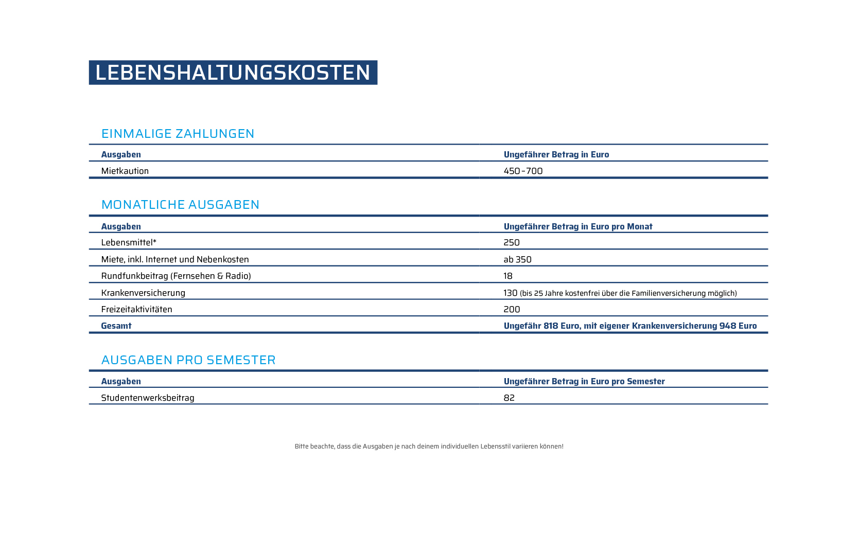 Die Finanzierung deines Studiums ist ein wichtiger Faktor bei der Entscheidung für ein Hochschulstudium. Deshalb haben wir eine Tabelle mit den Lebenshaltungskosten zusammengestellt, damit du weißt, wie viel finanzielle Unterstützung du benötigst und wie du deinen Lebensstil finanzieren kannst, um das Beste aus dem Studentenleben zu machen: