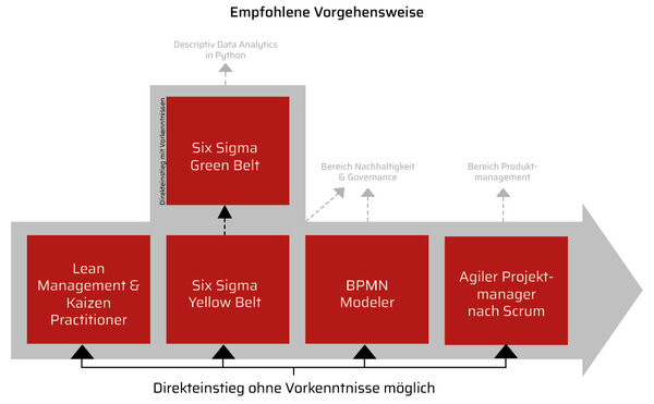 Diese Reihenfolge erlaubt es Ihnen, schrittweise von grundlegenden Prozessoptimierungsprinzipien bis hin zu fortgeschrittenen Projektmanagementmethoden zu lernen.