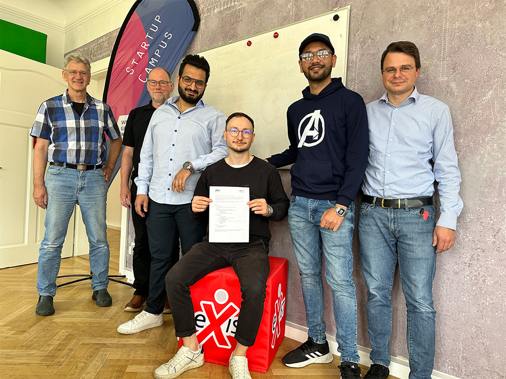 Bild (DIT): The future-link team with their mentors from DIT (from left): Prof. Dr.-Ing. Ludwig Gansauge, former President Prof. Dr. Peter Sperber, Ali Aljalali, Johannes Bardon, Shivam Parmar and Alfons Weinzierl from the Centre for Start-up Support.