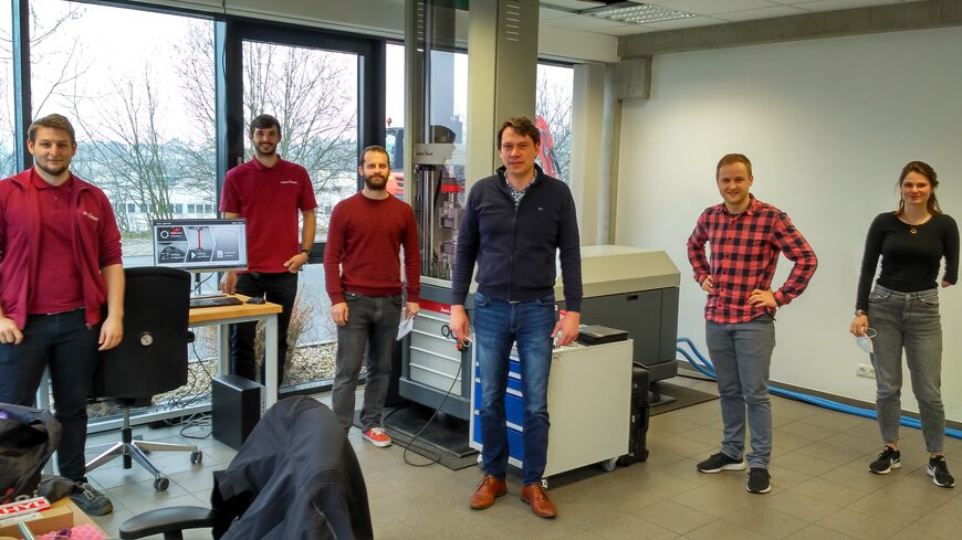 Pleased with the latest module in the test lab (from right): Research assistant Jaqueline Wiese, research assistant Markus Stockinger, Campus Director Prof. Dr.-Ing. Mathias Hartmann, research assistant Dr. Valentin Dalbauer with Zwick/Roell service technicians Patrick Volf and Kevin Merk.
