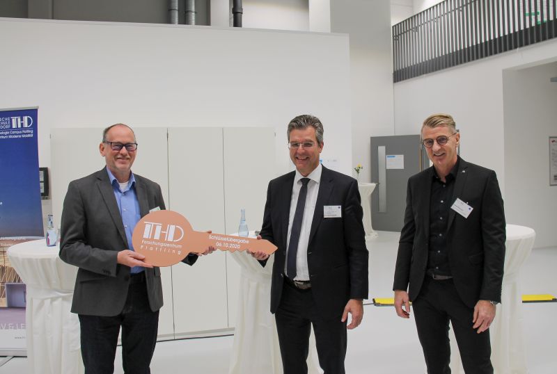 Bild (DIT): The key to the MoMo in Plattling has been handed over: DIT president Prof Dr Peter Sperber (left), Plattling’s first Mayor Hans Schmalhofer (centre) and architect Robert Brunner.