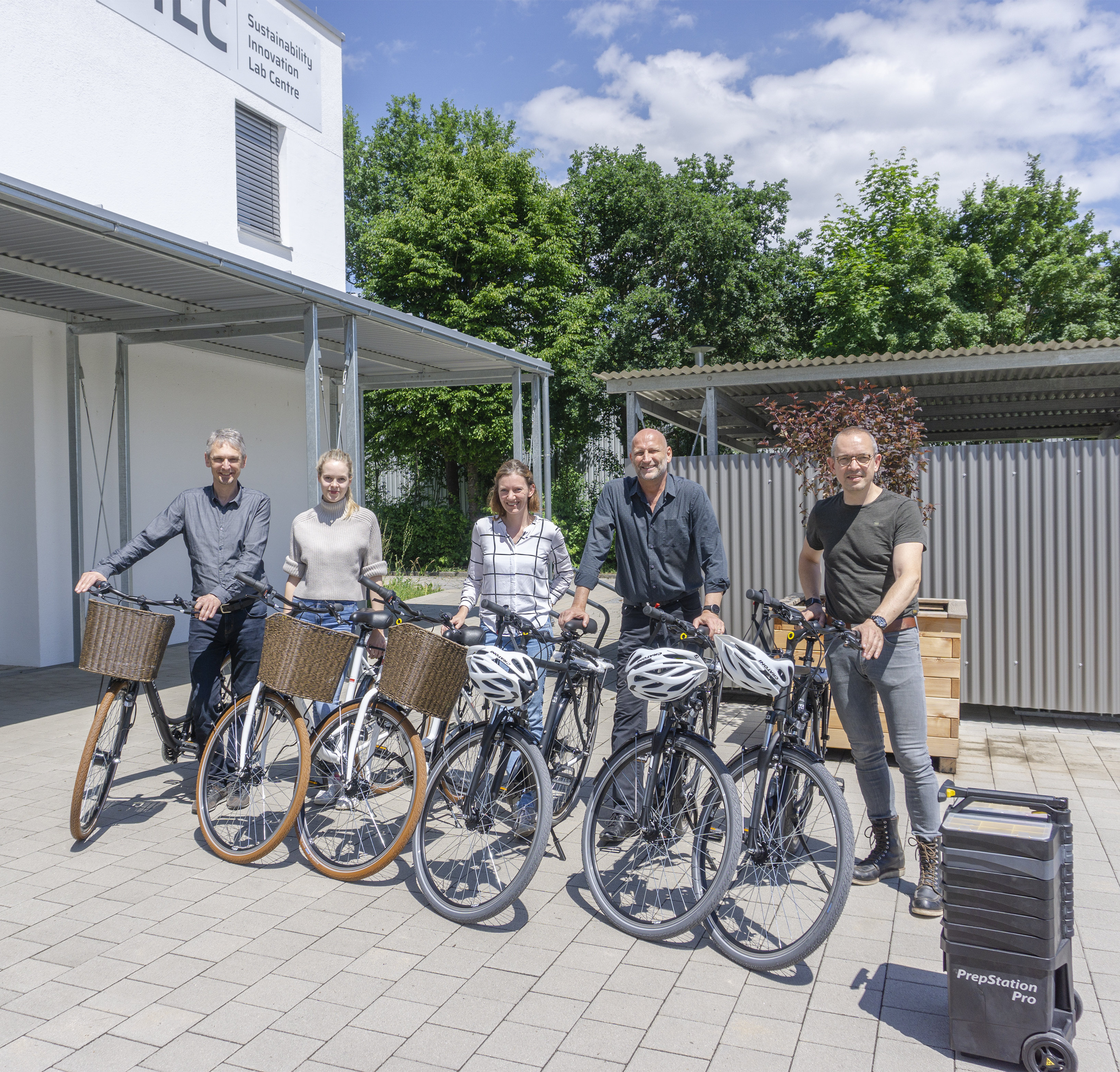 Bild (ECRI / DIT): Inaugurating the new company bikes: (from left) Prof. Dr. Christian Steckenbauer (Dean, Economy in Tourism Management), Laura Hoffmann (research assistant to Prof Dr. Michael Laar, HSB), Anna Marquardt (laboratory engineer, sustainability laboratory, bicycle workshop), Prof. Dr. Michael Laar (head of HSB, sustainability officer), Prof. Dr. Sascha Kreiskott (laboratory head, sustainability laboratory, deputy sustainability officer)