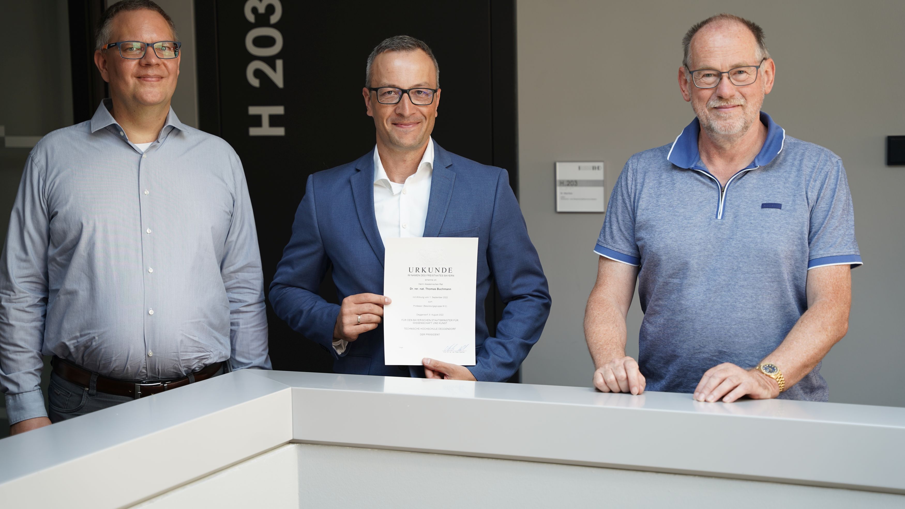 Bild (DIT): Dr. Thomas Buchmann (centre) started as a professor at DIT on 1 September. DIT President Prof. Dr. Peter Sperber (right) and Prof. Dr. Marcus Barkowsky, member of the faculty council, were present at the appointment.