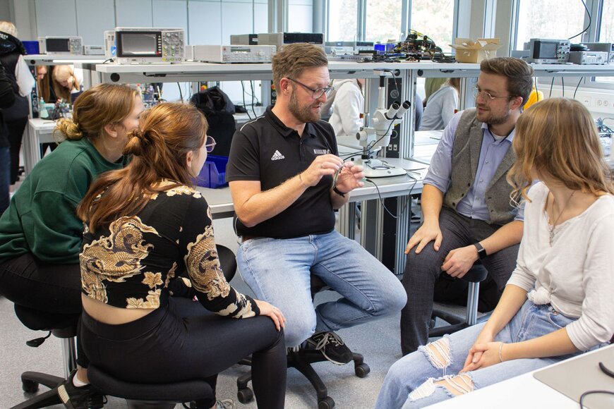 Bild (ECRI / DIT): In the EEE laboratory, laboratory engineer Wolfgang Schauer (centre) gave the students an introduction to soldering.