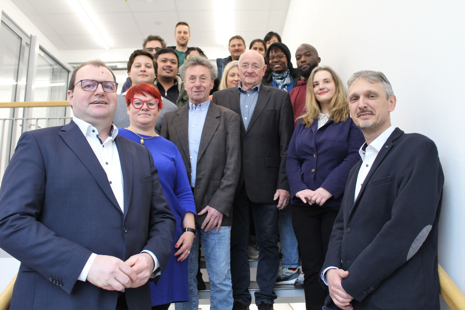 Bild (DIT / ECRI): Some students of the winter school during the visit of District Administrator Michael Fahmüller (left), 2nd Mayor of the City of Pfarrkirchen, Hans Hirl and Georg Riedl (both centre).