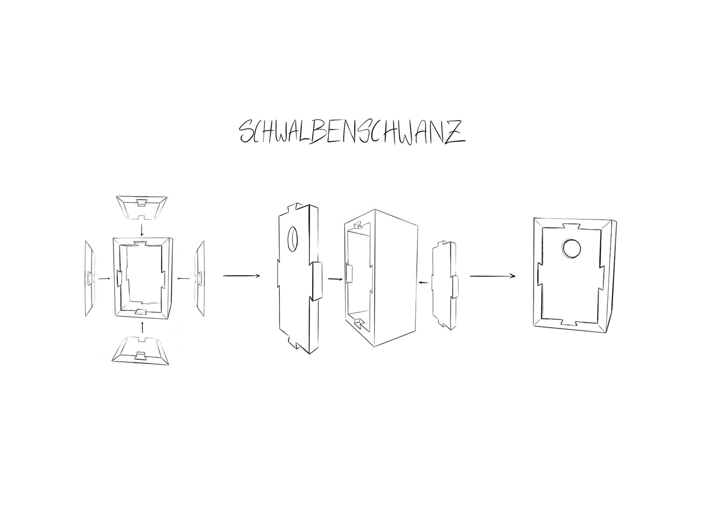 Our solution is the craft as well as linguistically appropriate swallowtail principle. We have applied this principle to our entire bird house. Thus, the bird house can be assembled and disassembled in a short time. During assembly, the back plate is first screwed down, either to the tree or to a wall.