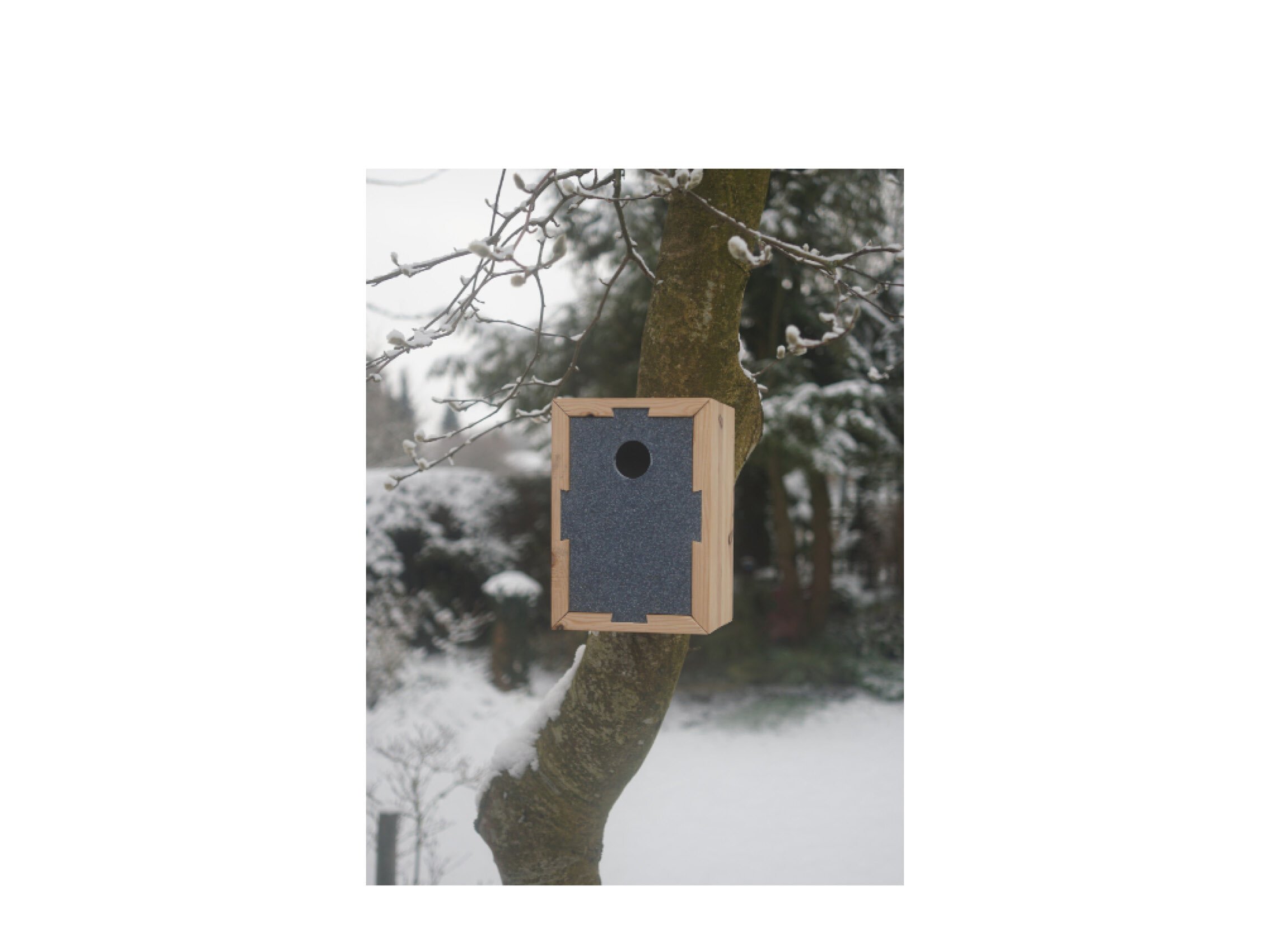 Thus, the front is made of Corian, a solid surface material that is characterised by recyclability and durability. The rest is made of ecological European spruce wood. Thanks to the dovetail principle, our bird house does not require the use of adhesives or screws during assembly.
