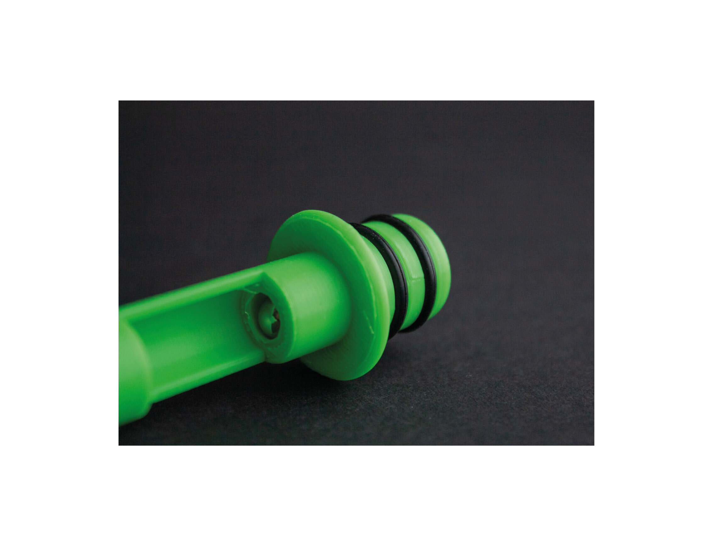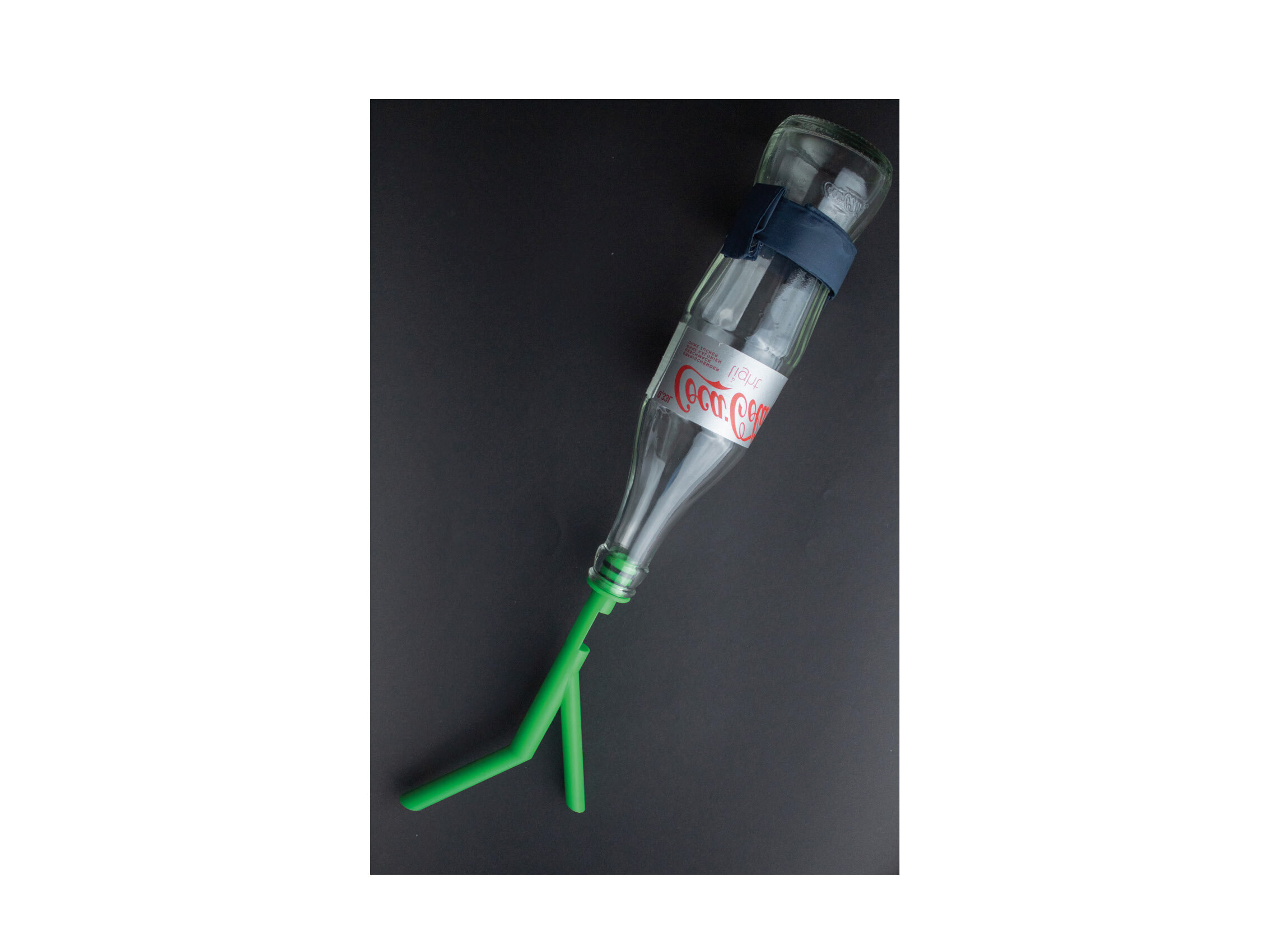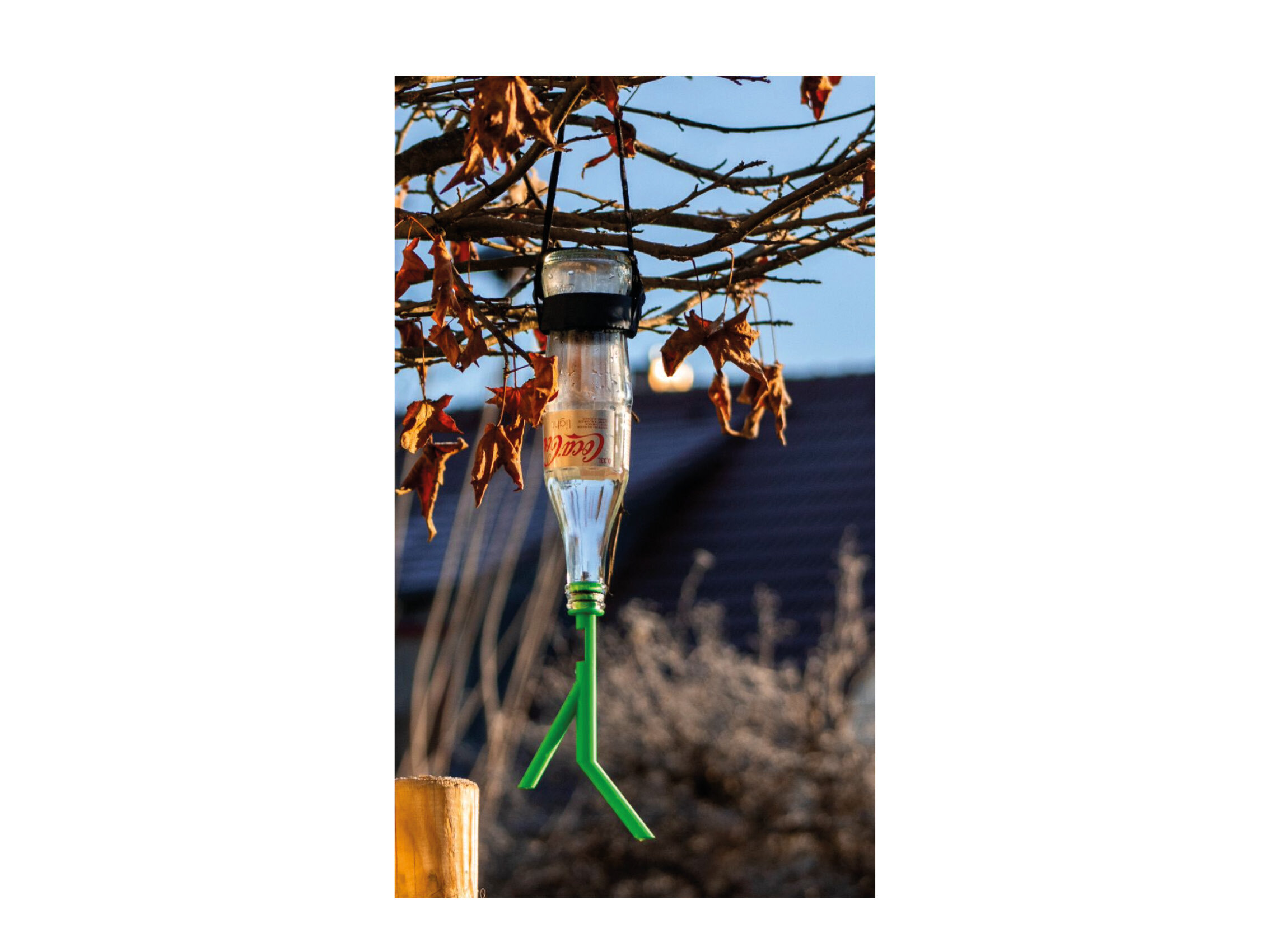 The centrepiece, a stylised branch. This is inserted into the bottle opening, and two sealing rings seal the bottle. A metal ball is integrated into the element, as is common in commercially available small animal drinking troughs. The design is such that it provides a safe landing place for birds. The mouthpiece can be pulled out at the end of the stem to prevent contact with diseases. The landing place was designed as an abstract branch.