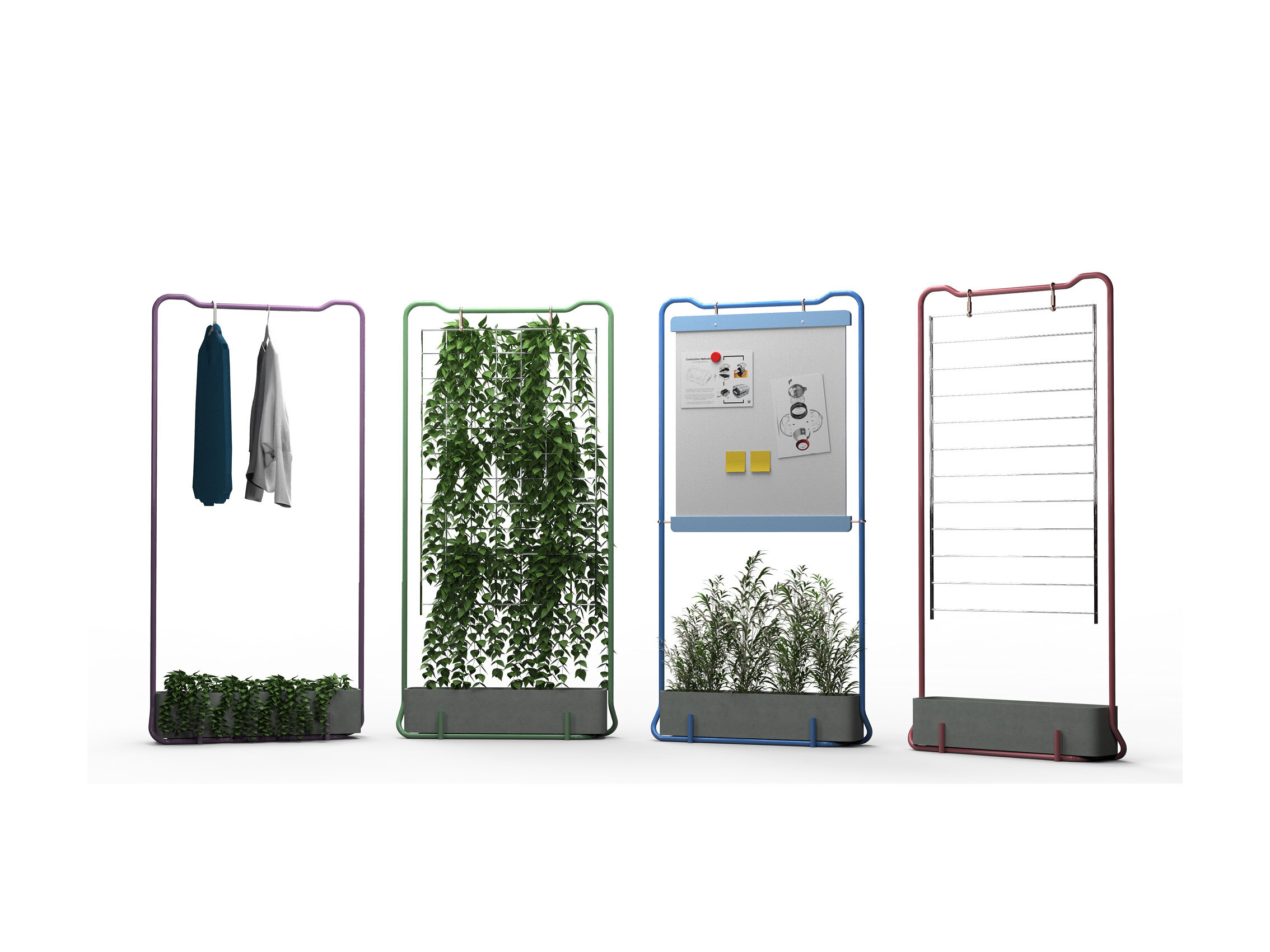 By taking the Balconia pot as a base element, we were able to design multifunctional, modular & fluid constructions for our frames from some simple rules and several iterations. Our two designs, Line 6 and Line 12, have different use cases. Line 12 can hold three pots and Line 6 can hold one pot. Line 6 is a multifunctional rack that also functions as a clothes rail, clothes rack and pinboard. Line 12, on the other hand, is a heavier frame that is used purely as an indoor garden.